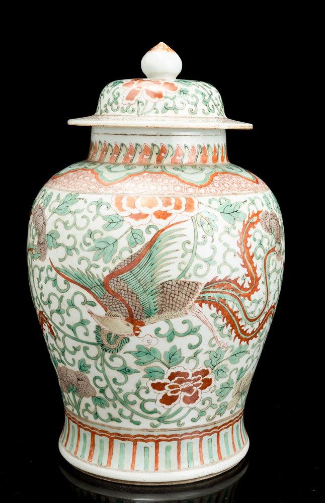 Potiche in porcellana Famiglia Verde con figure di fenici e decori floreali, Cina, [..]