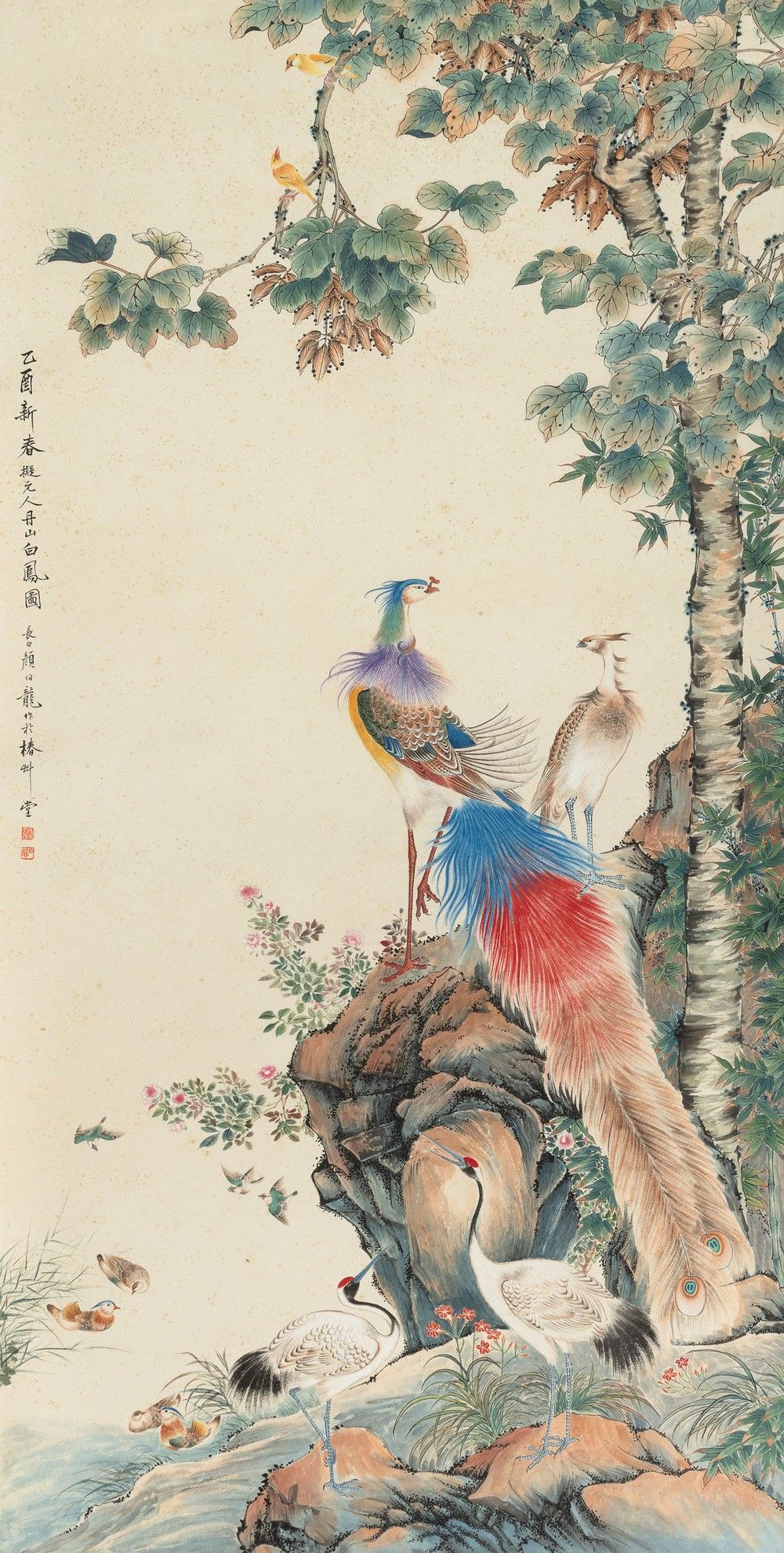 Scroll su carta raffigurante pavoni entro paesaggio e iscrizione, Cina, Dinastia [..]
