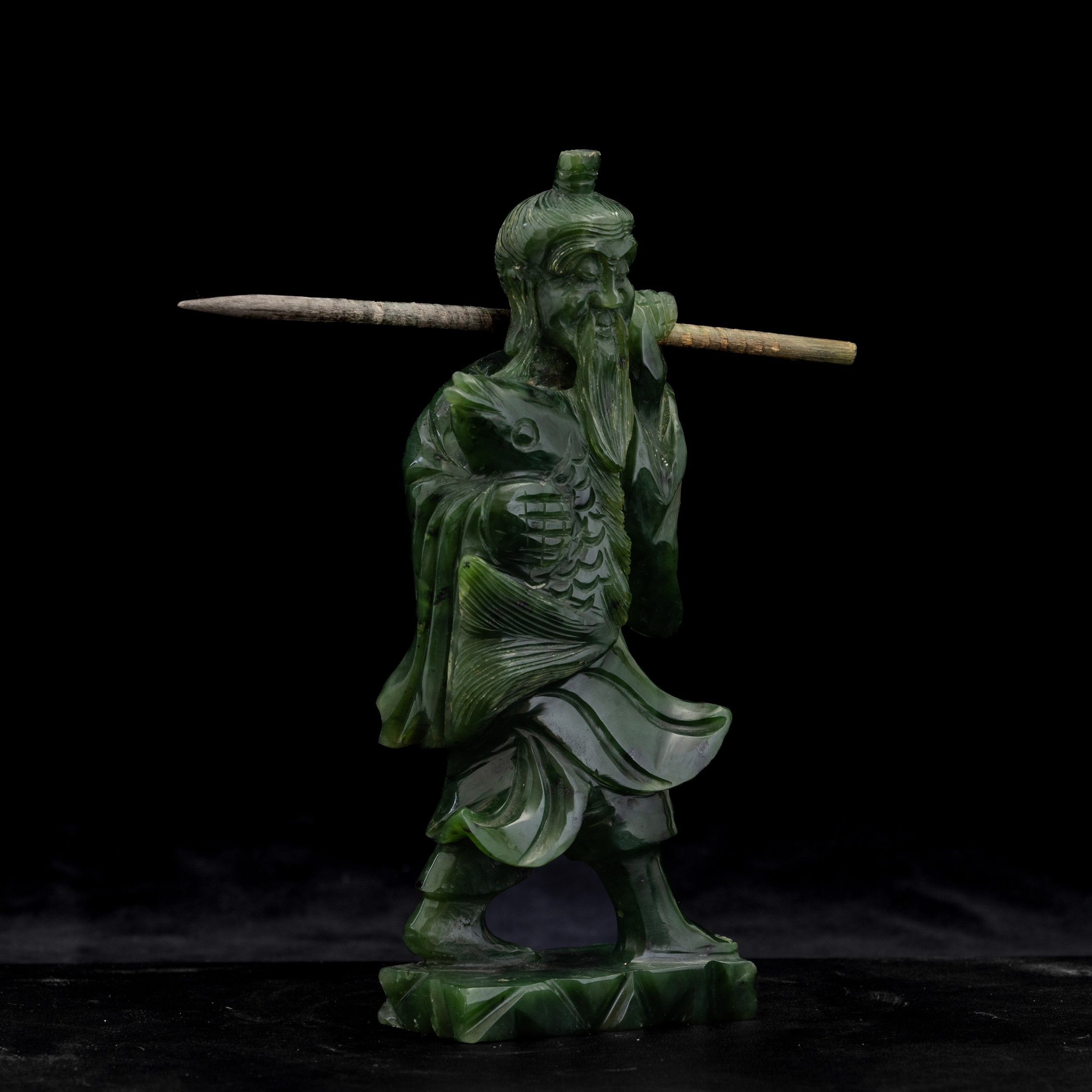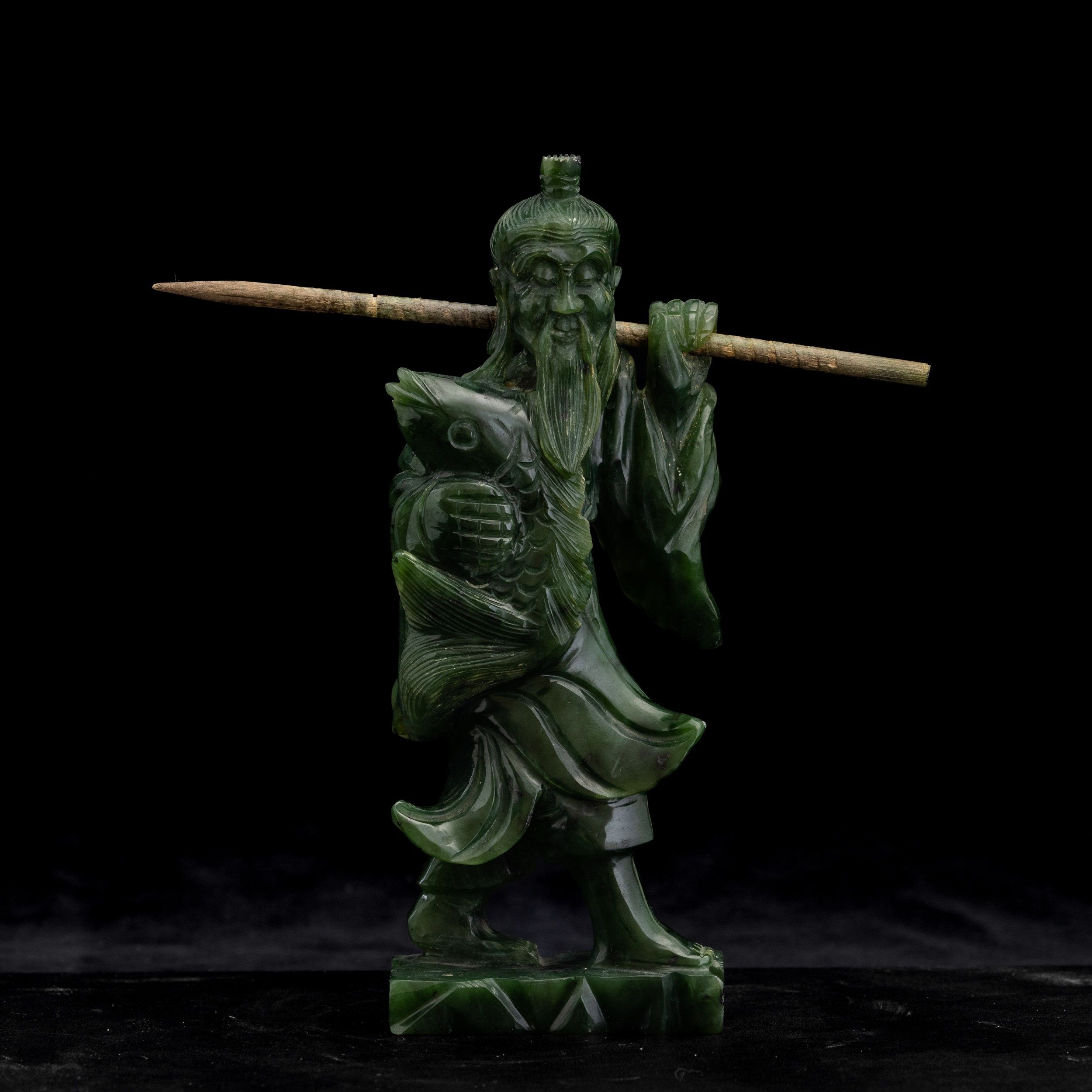 Scultura raffigurante pescatore in giada spinacio, Cina, XX secolo