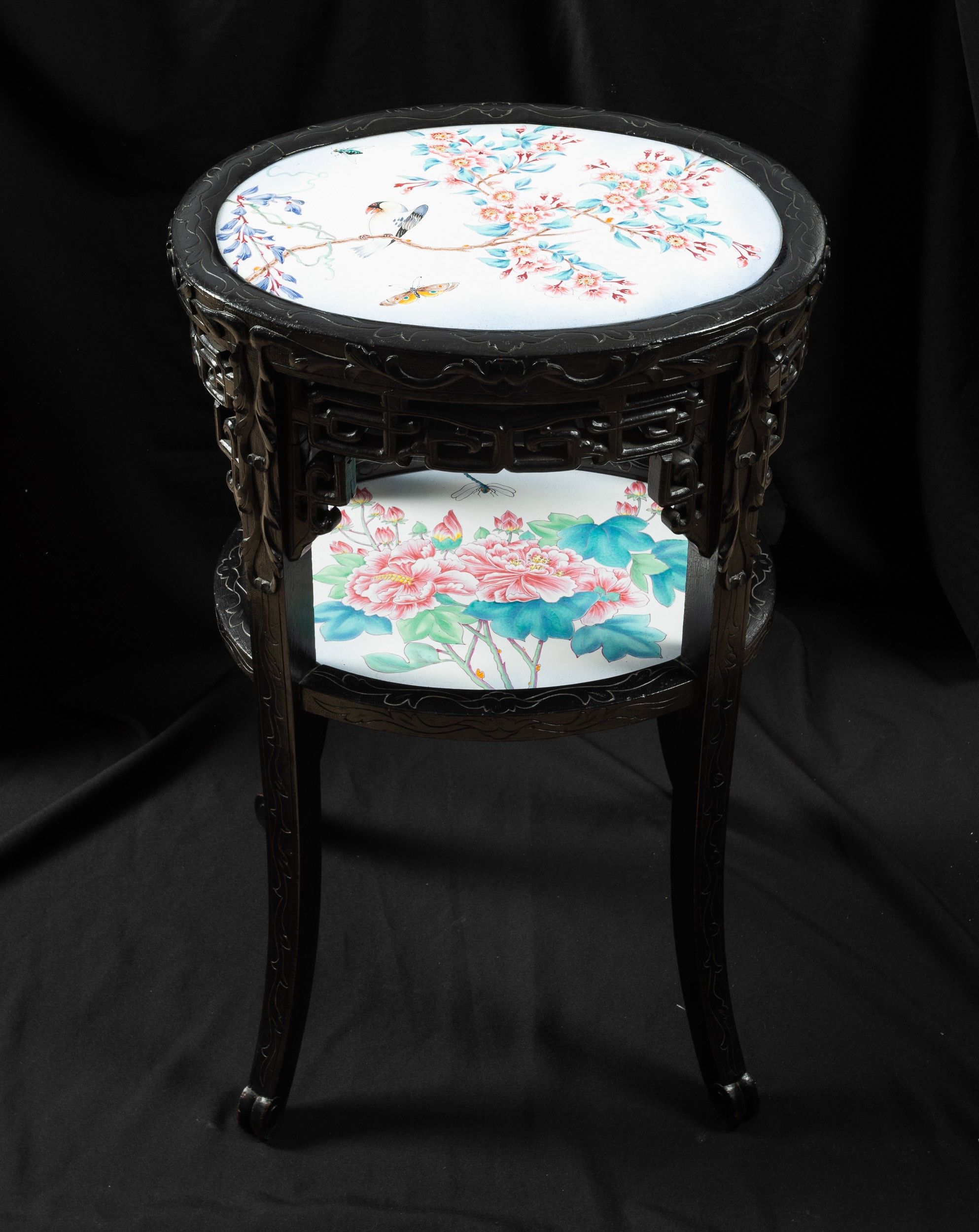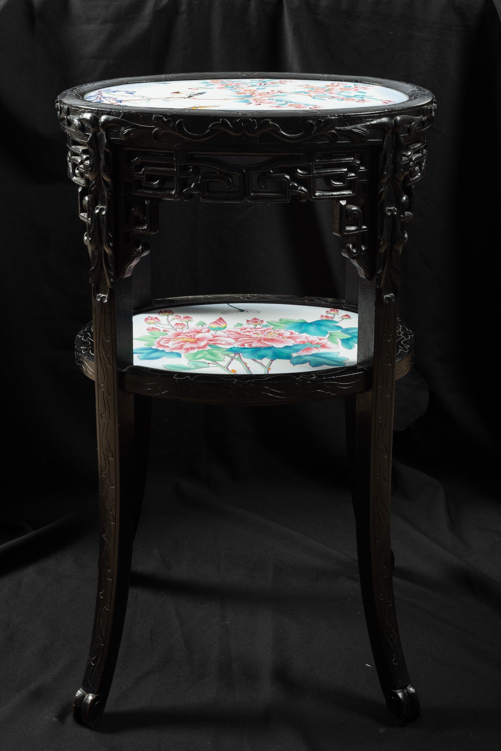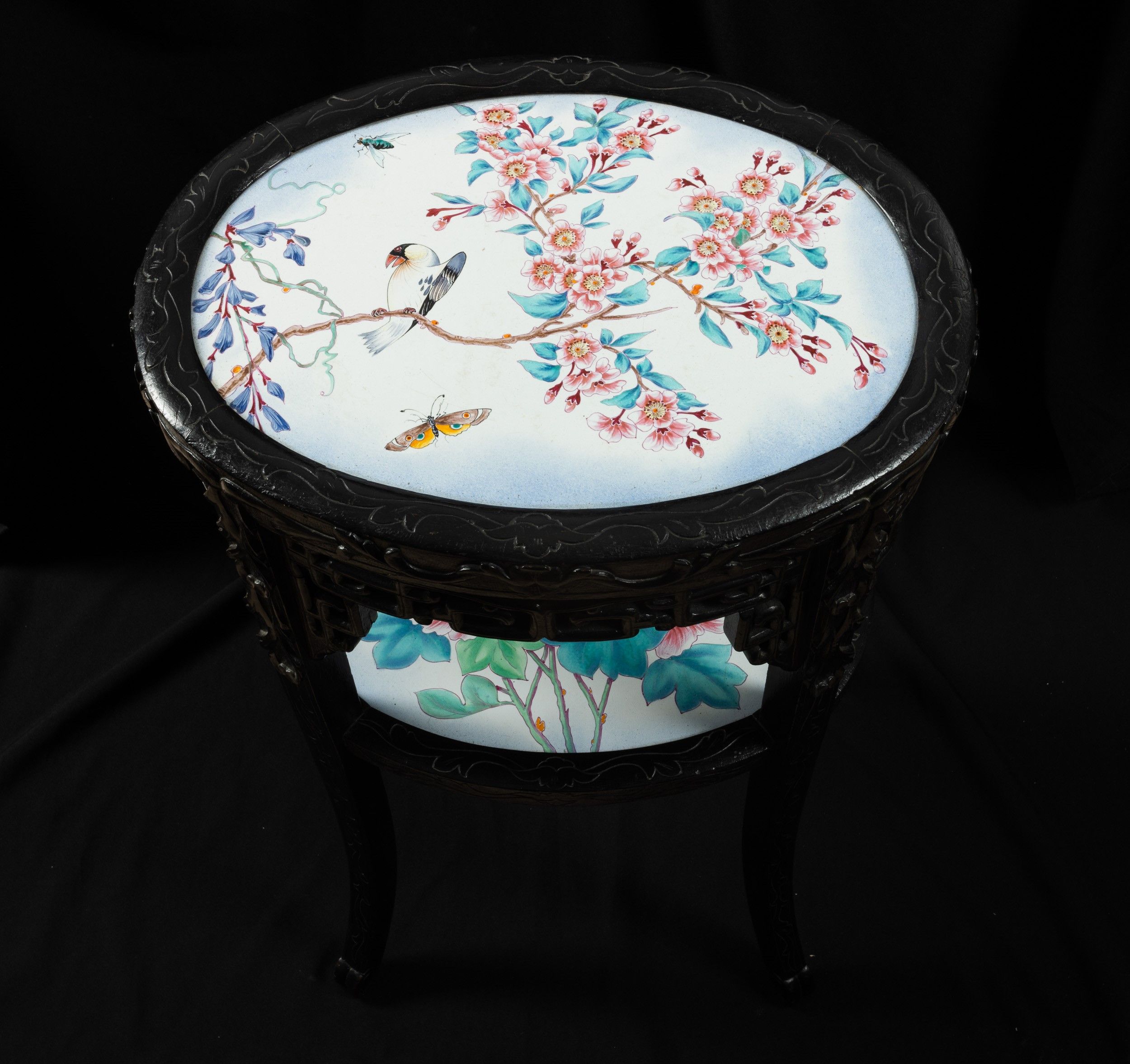 Tavolino con placche in porcellana raffigurati soggetti naturalistici con rami in [..]