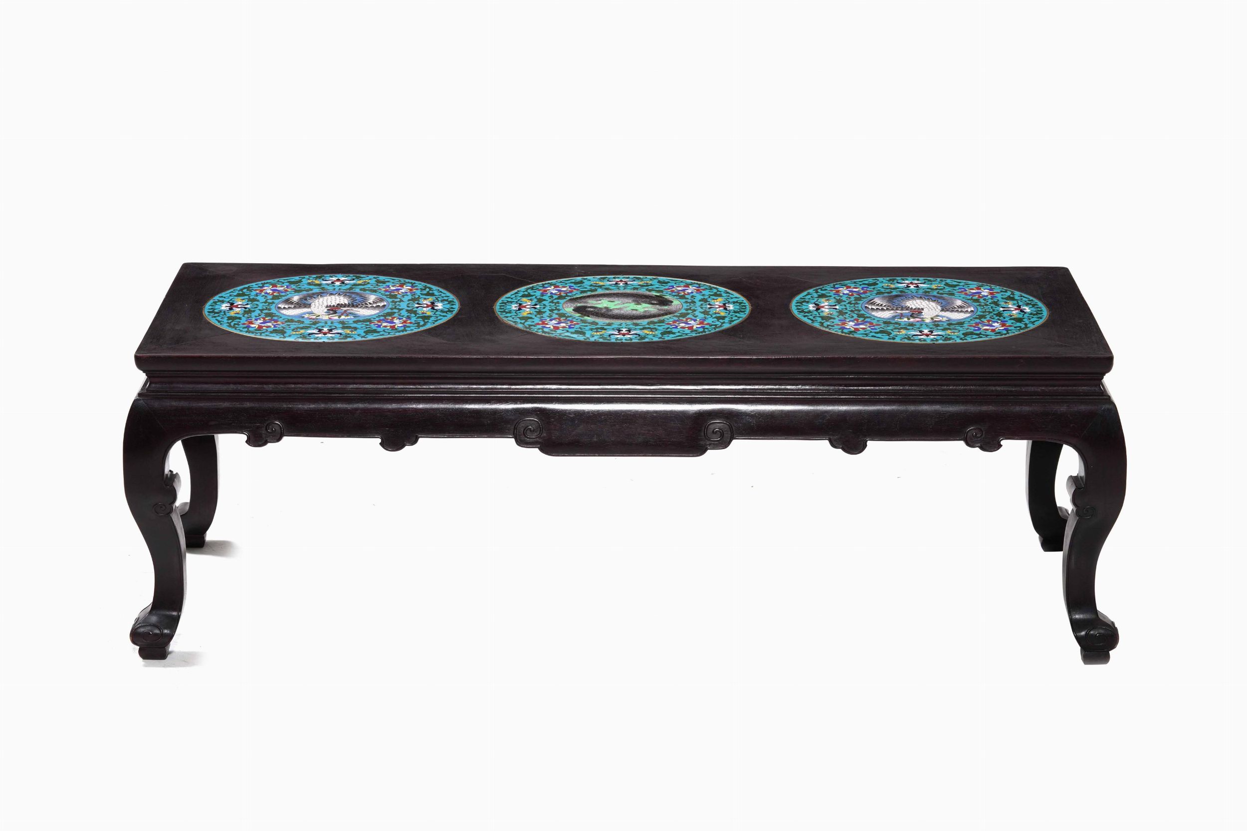 Tavolo basso con medaglioni a smalti cloissonè raffiguranti carpe, aironi e decori [..]