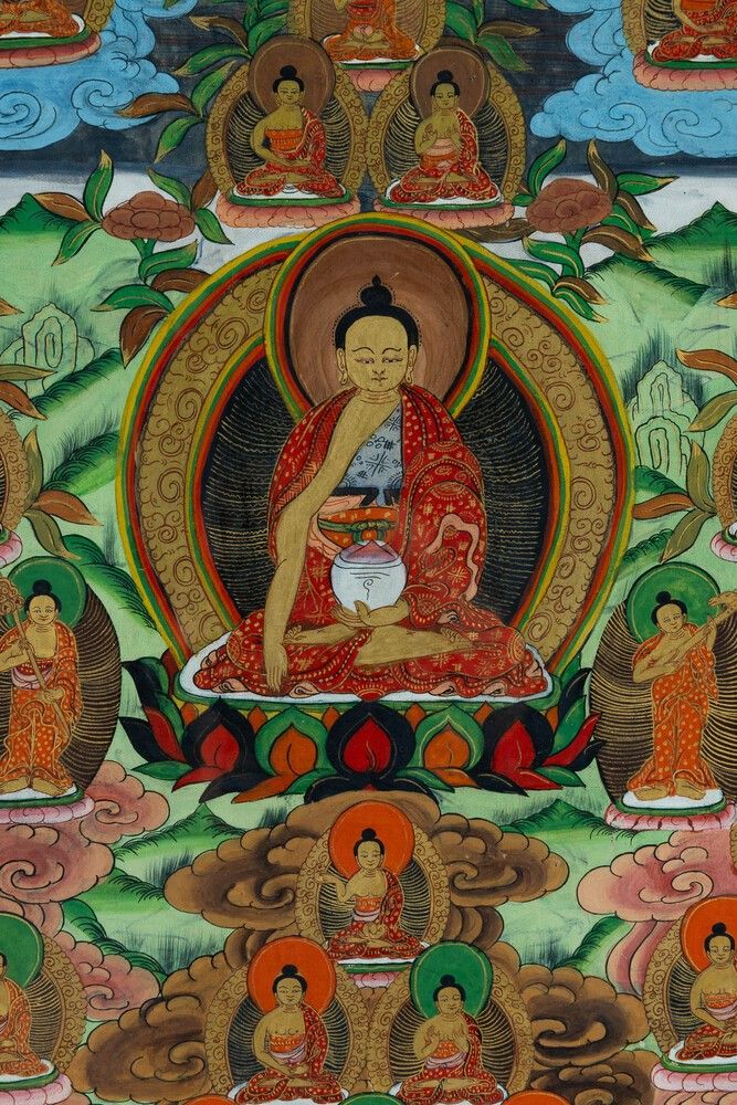 Thangka su seta con figura di Lama centrale e altre divinità, Tibet, XIX secolo