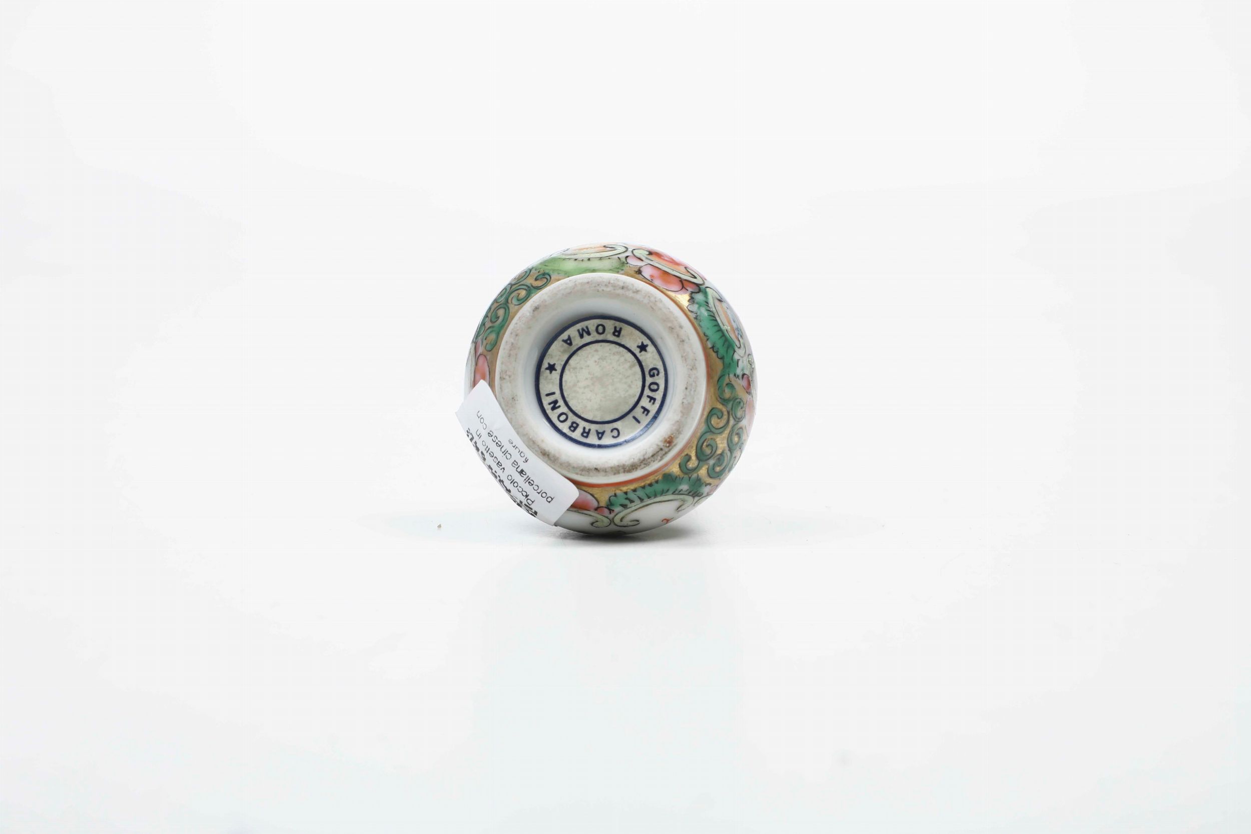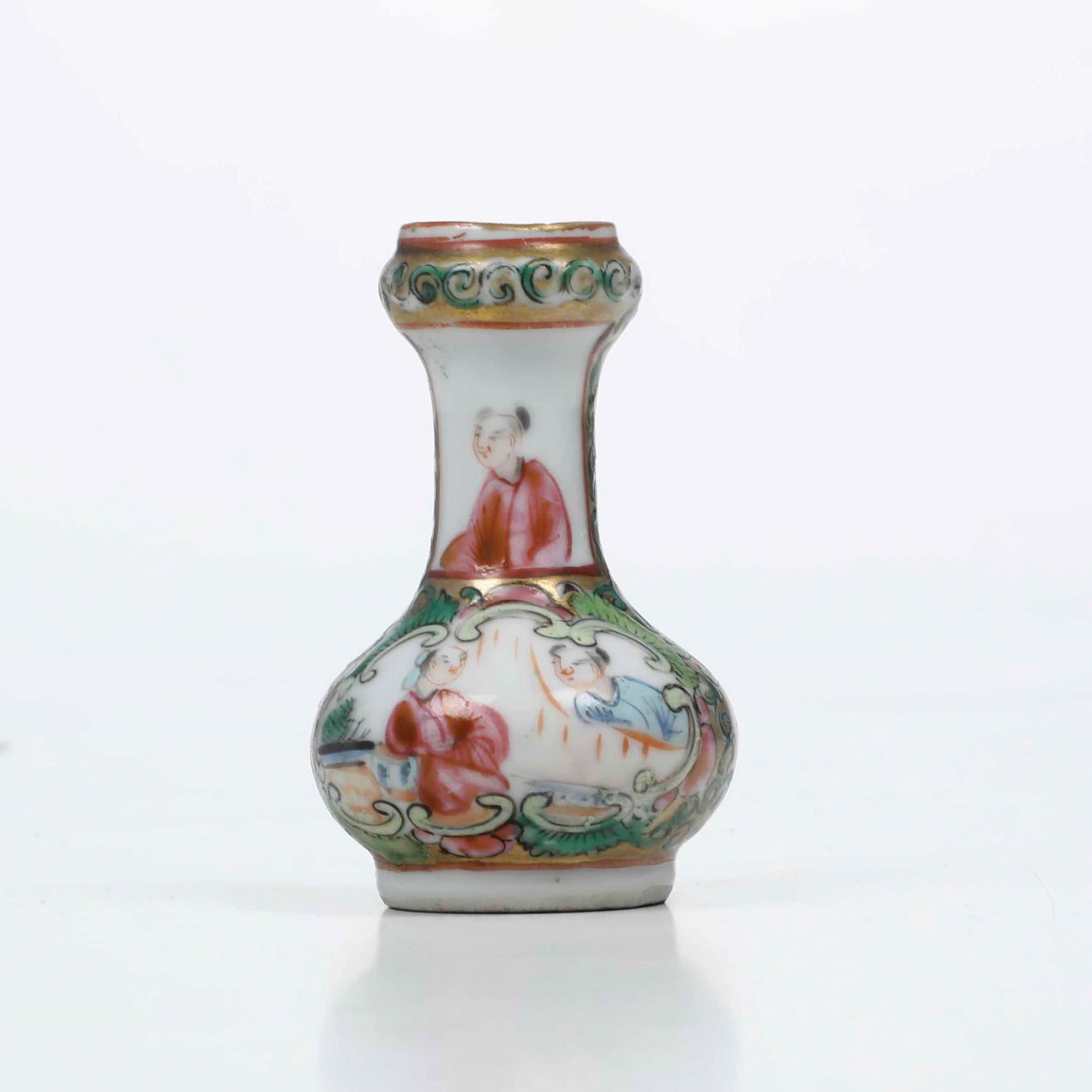 Vasetto in porcellana raffigurante scene di vita comune entro riserve e decori floreali, [..]