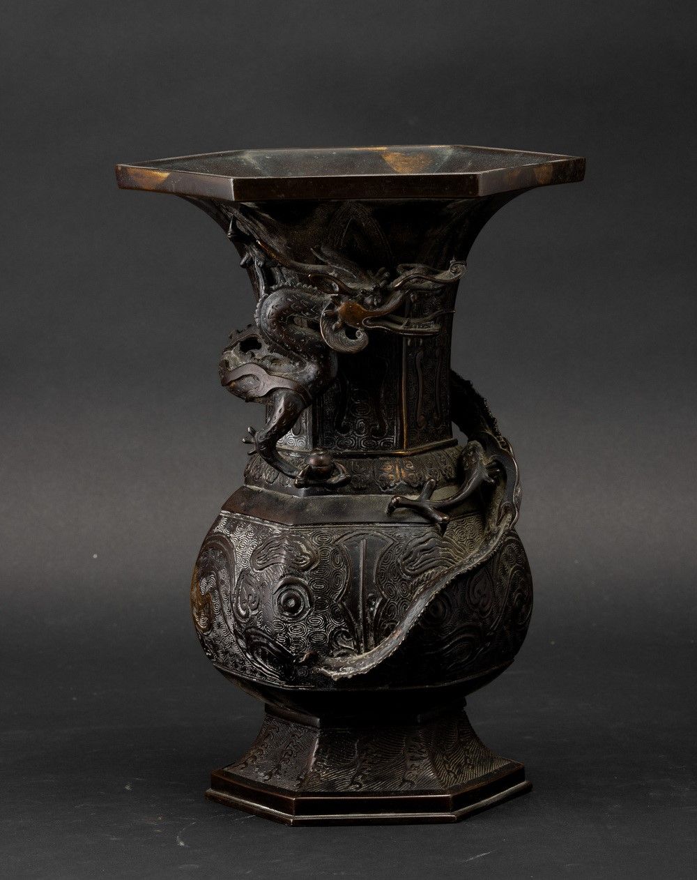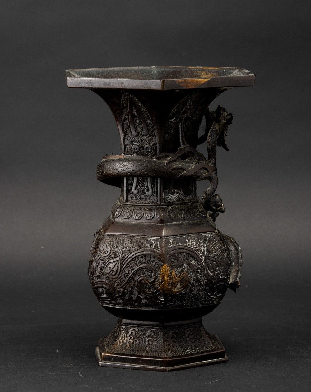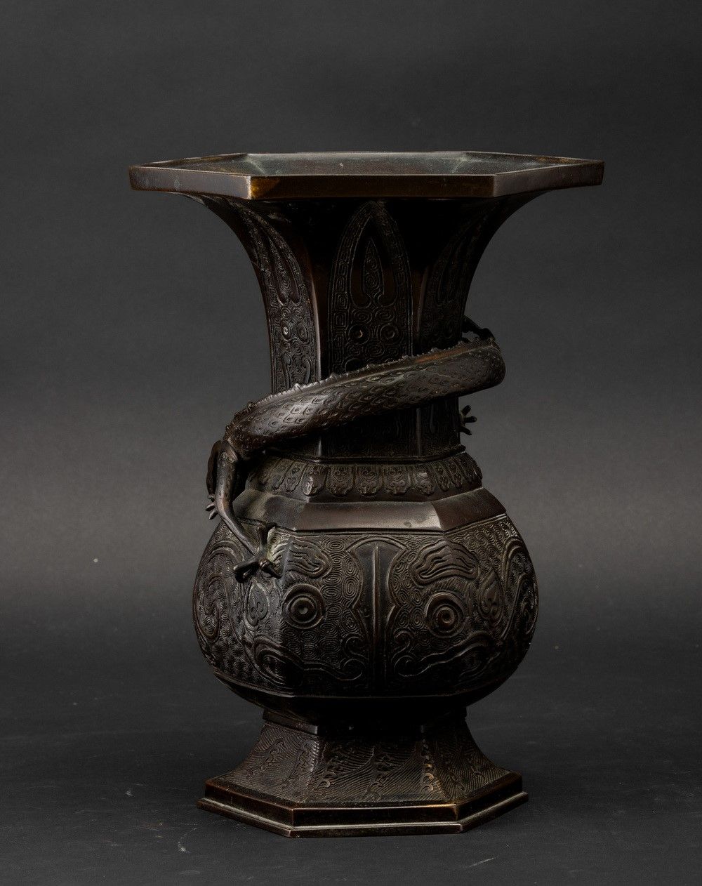 Vaso a tromba in bronzo con decori d'ispirazione arcaica e figura di drago a rilievo, [..]