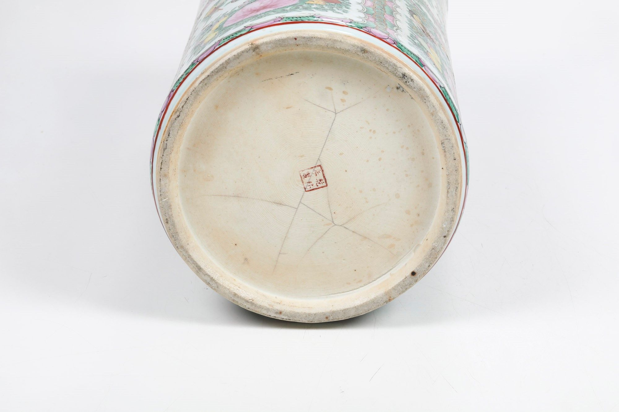 Vaso cilindrico in porcellana Famiglia Rosa con decori floreali entro riserve, Cina, [..]