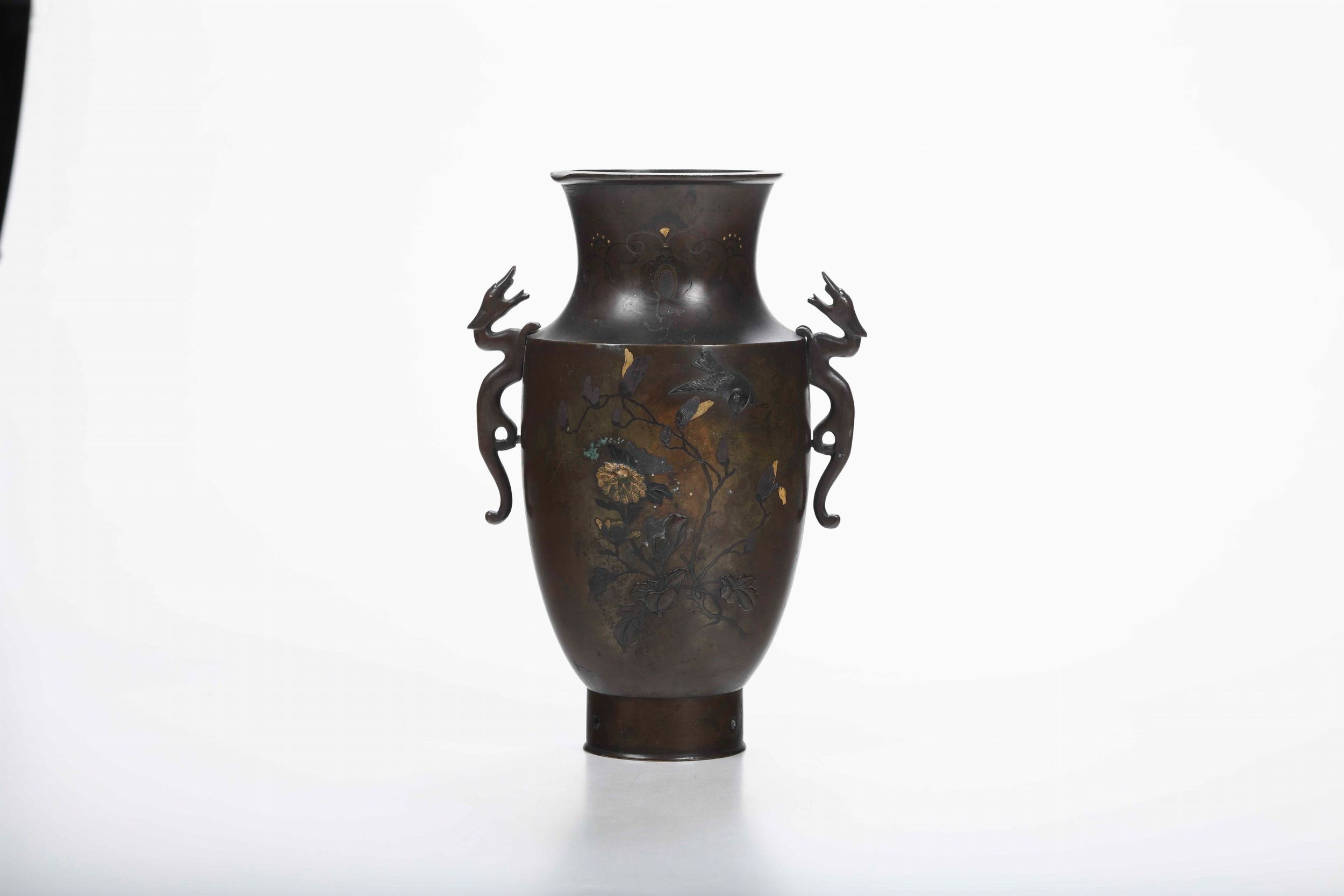 Vaso in bronzo con decori floreali parzialmente dorati e anse a foggia di draghetto, [..]