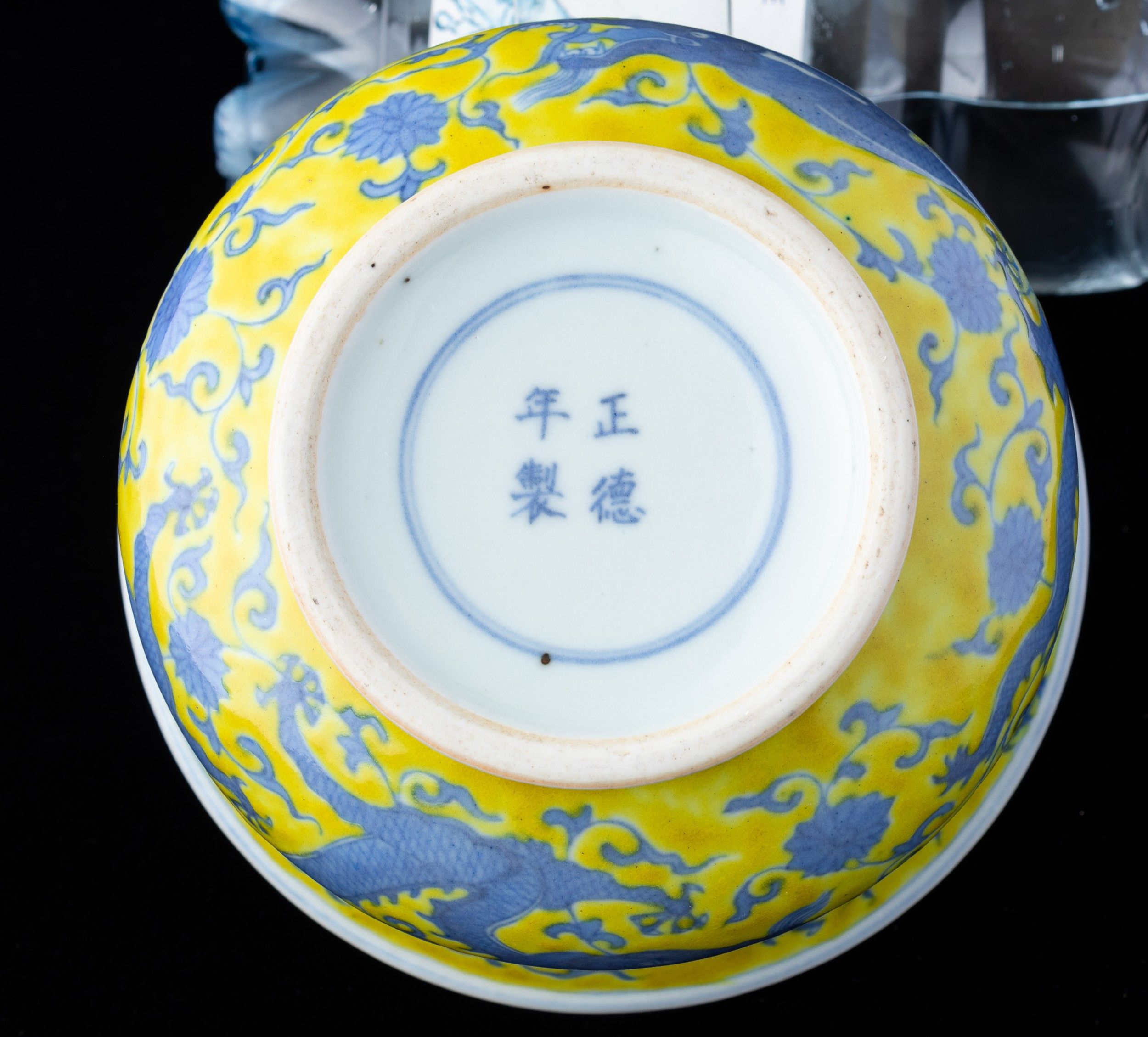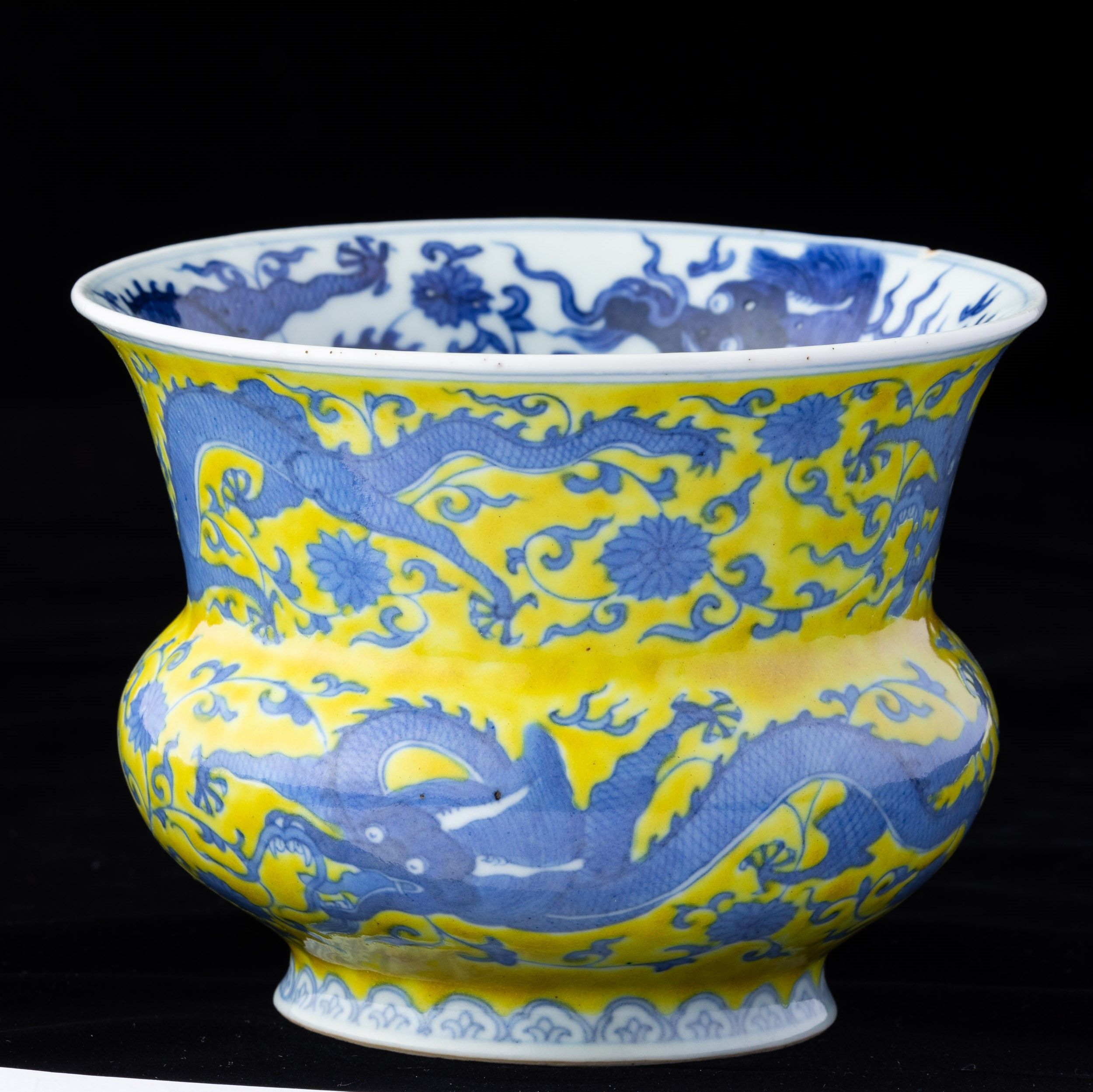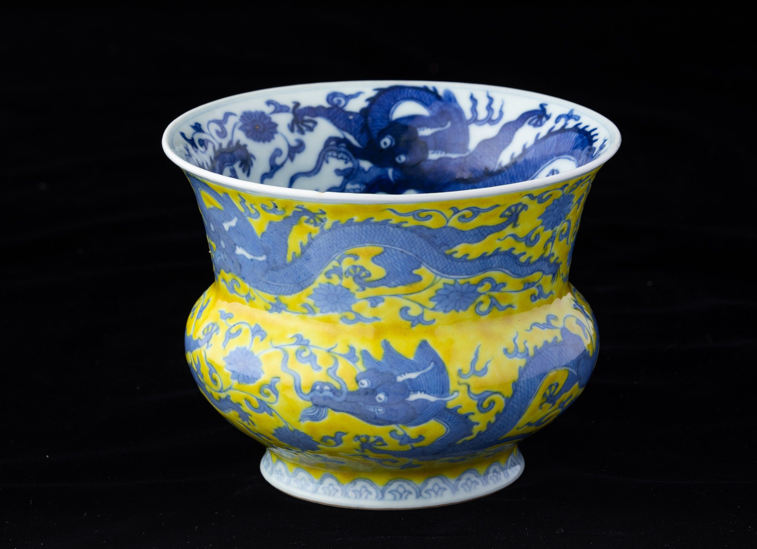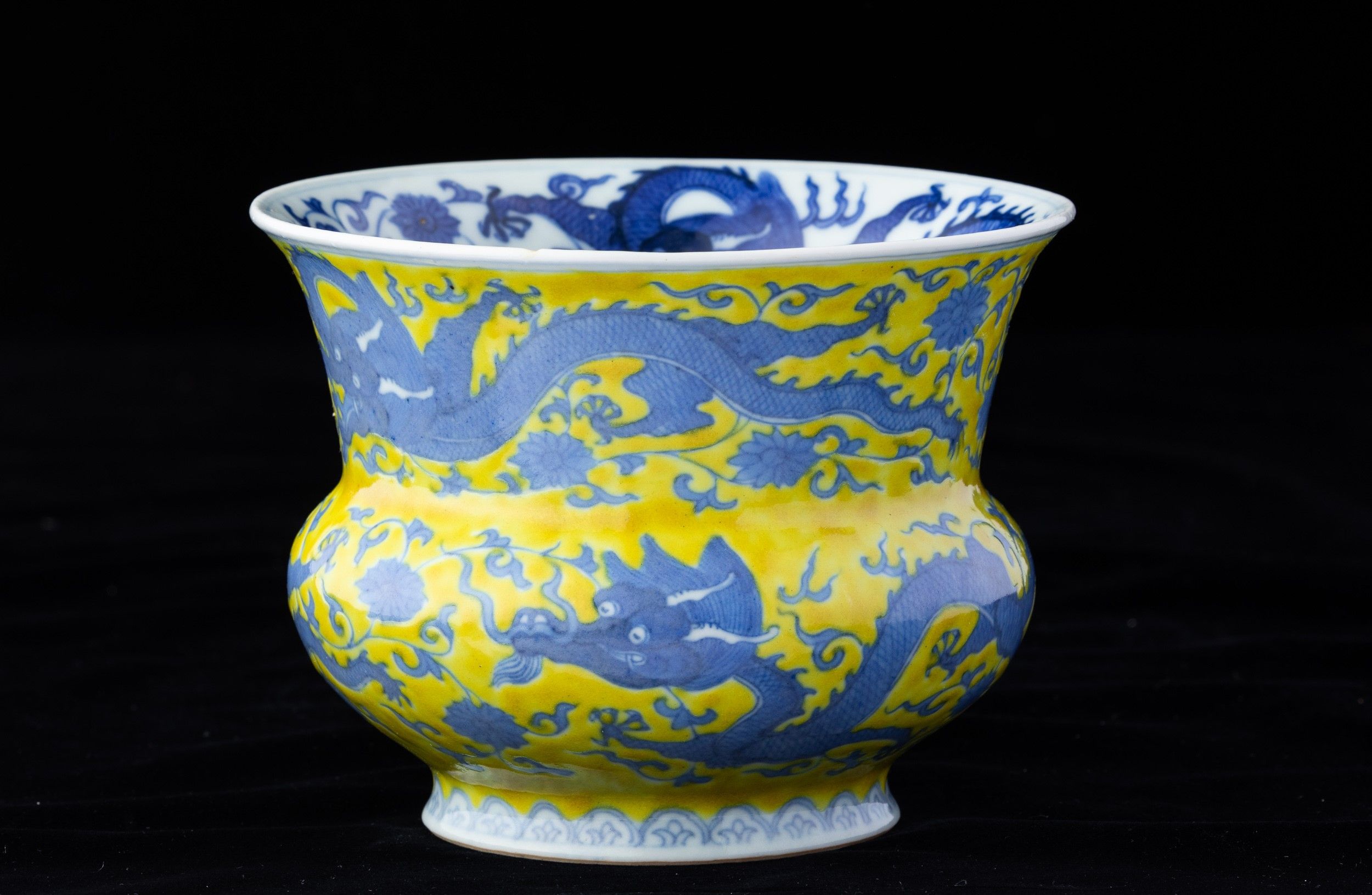 Vaso in porcellana con figure di draghi e decori vegetali sui toni del blu su fondo [..]