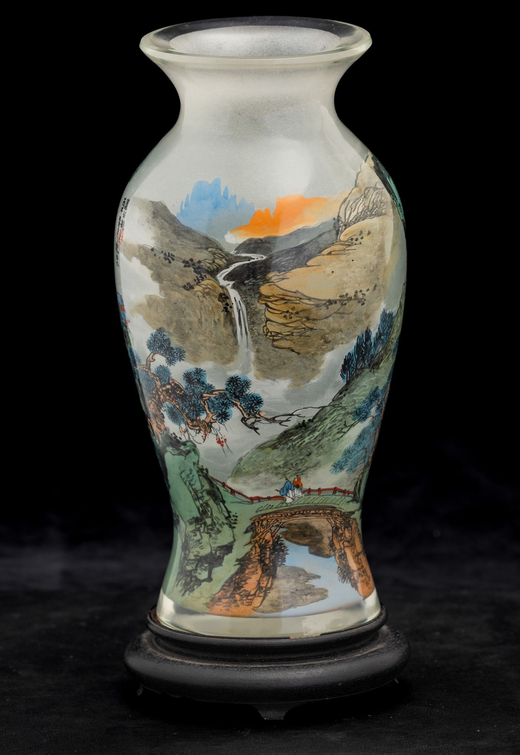 Vaso in vetro dipinto raffigurante paesaggio con figure e iscrizioni, Cina, Dinastia [..]