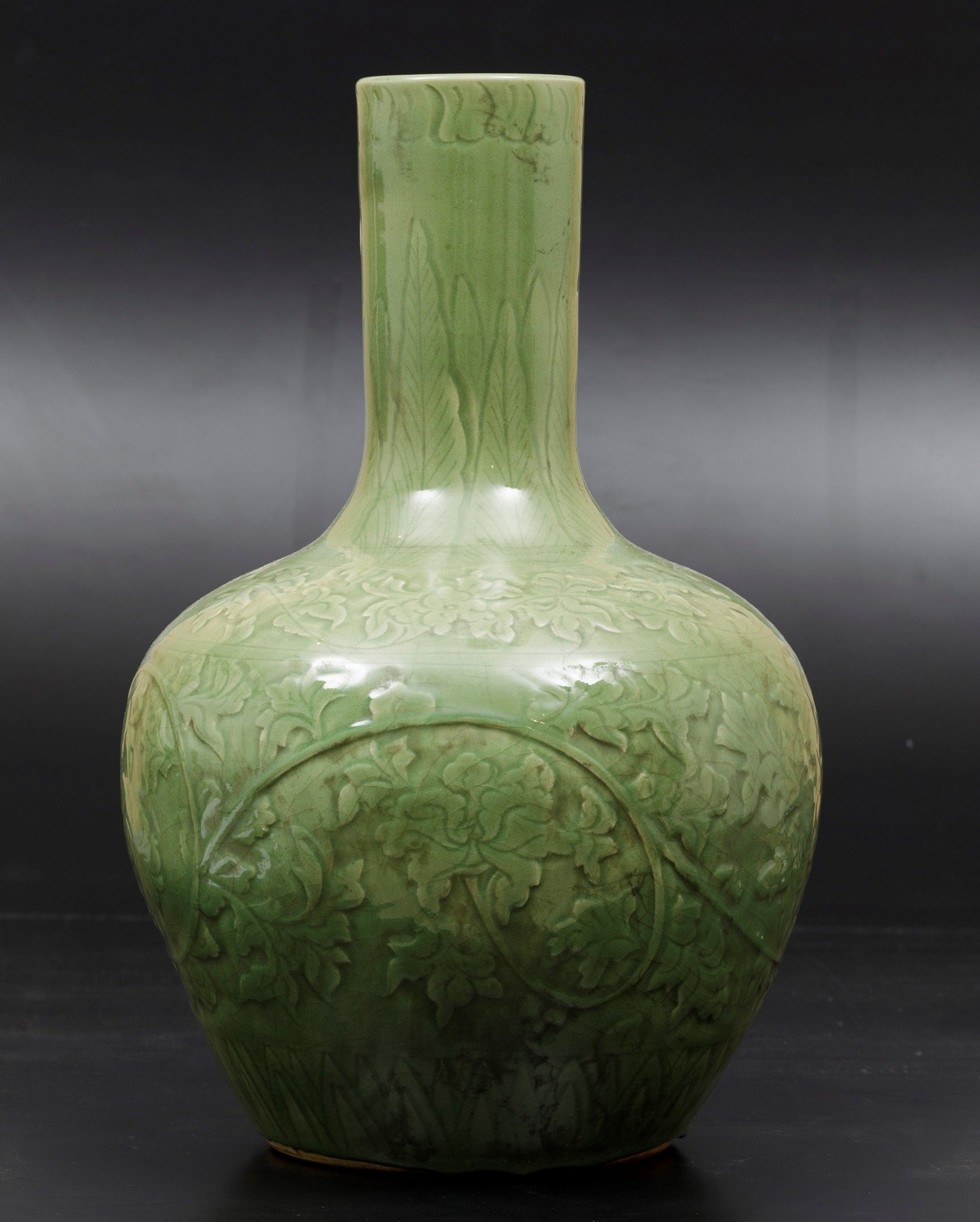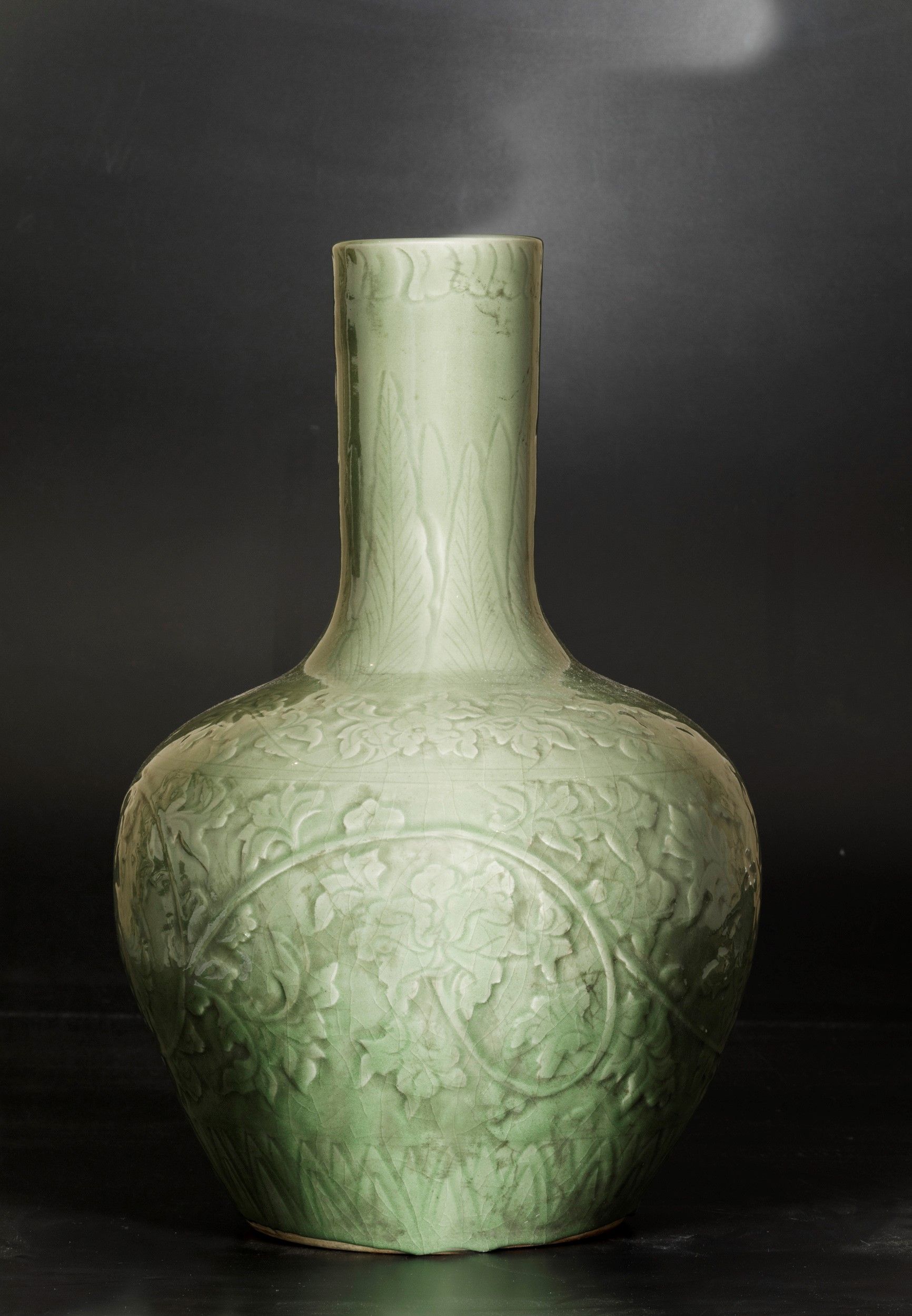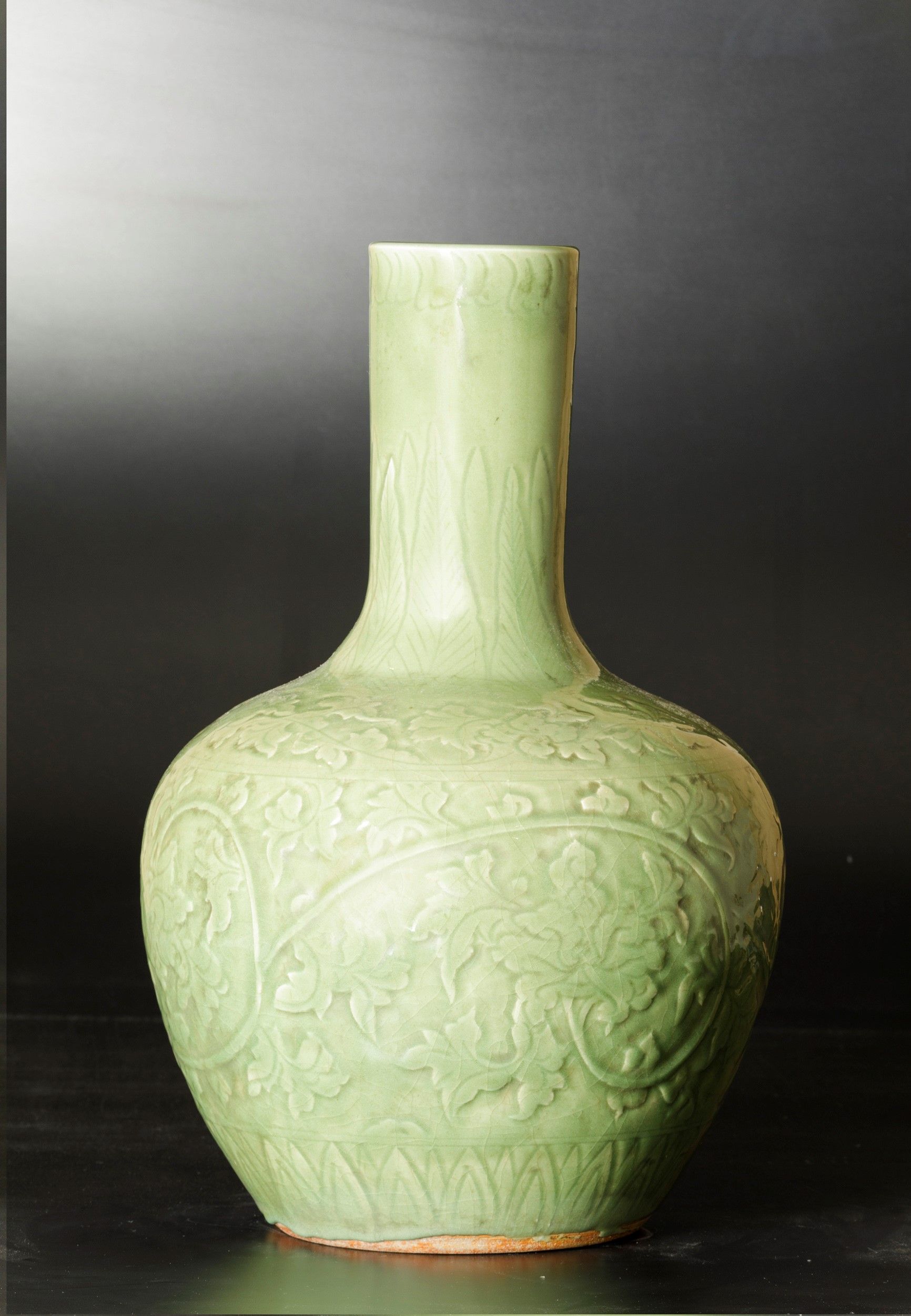 Vaso Tianqiuping in porcellana Celadon con decori a racemi vegetali, Cina, Dinastia [..]