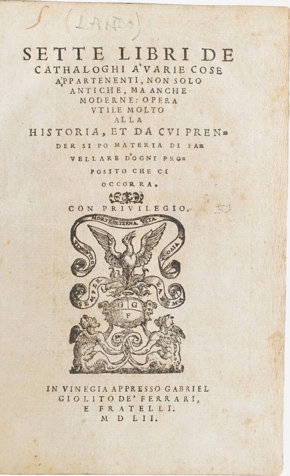 Lando, Ortensio Sette libri dei cataloghi a varie cose appartenenti ... in Vinegia, [..]