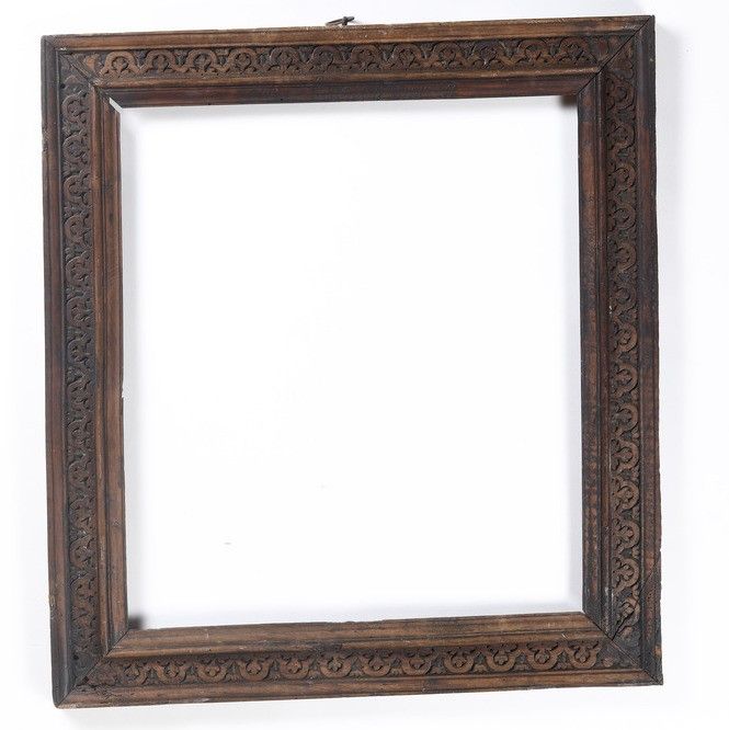 Antica cornice in noce intagliata con motivi a palmette, piccaglio originale