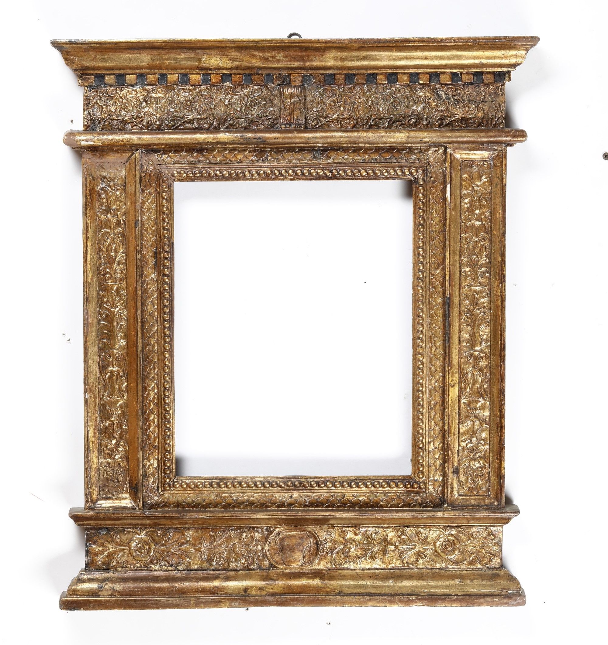 Cornice a edicola in stile rinascimentale intagliata, laccata e dorata, XIX-XX s [..]