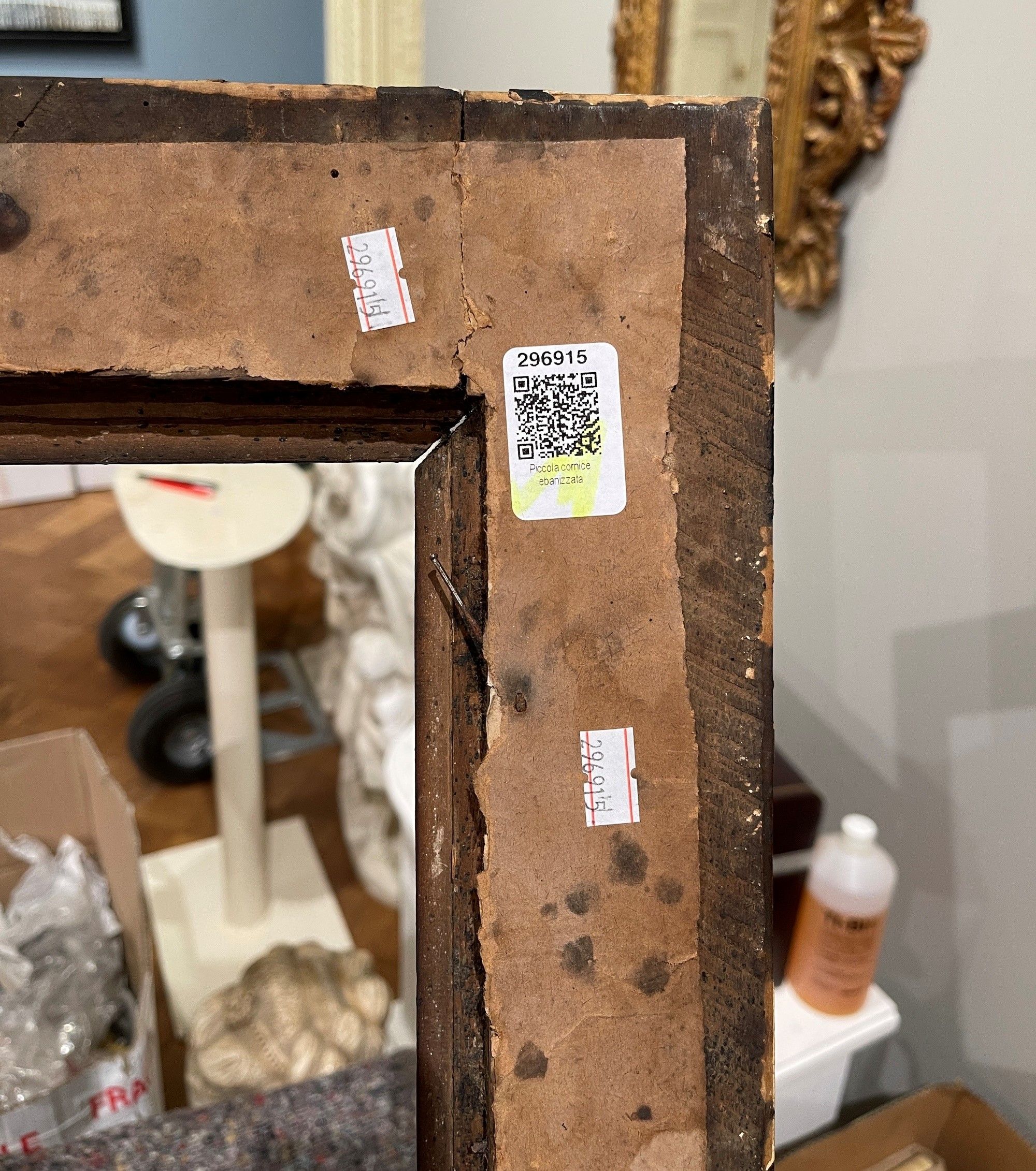 Cornice in legno ebanizzato con profili dorati, battuta a foglie