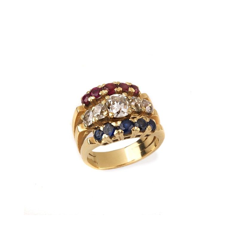 ANELLO A FASCIA CON PIETRE DI COLORE E DIAMANTI in oro giallo 18kt, impreziosito da una fila centrale di diamanti taglio vecchio per ct 1.60 circa affiancata da zaffiri e rubini taglio rotondo per ct 0.90 circa, mis. 15/55, gr. 12