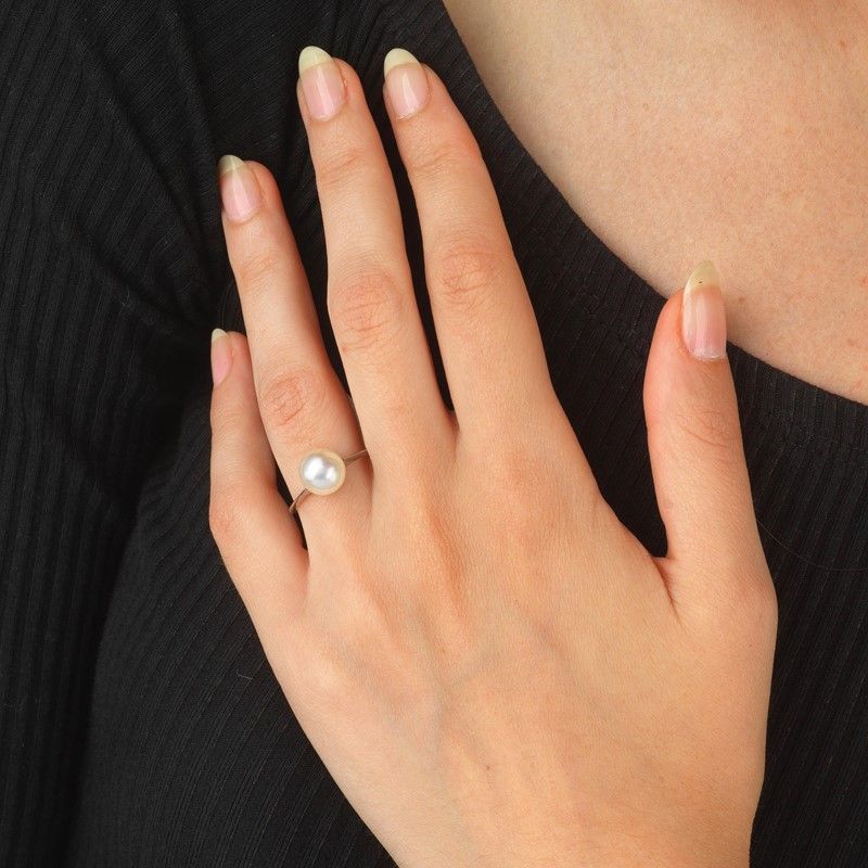 in oro bianco 18kt, sulla sommità una perla di mm 8 circa, punzoni 750 e del fabbricante, mis. 60, gr. 2