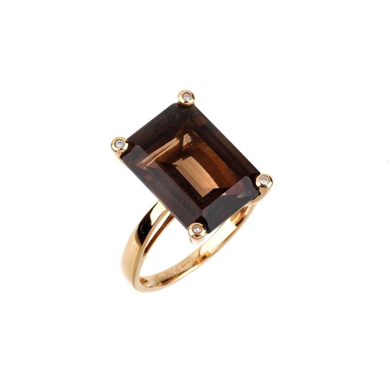in oro giallo 18kt, impreziosito da un quarzo fumé taglio ottagonale di ct 7.80 circa, punzone 750 e del fabbricante, mis. 13/53, gr. 5