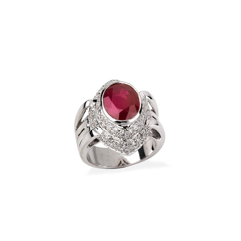 ANELLO CON RUBINO GLASS FILLED E DIAMANTI in oro bianco 18kt, impreziosito al centro da un rubino "glass filled" taglio ovale di ct 4 circa, circondato da diamanti taglio brillante per ct 1.50 circa, punzone 750, mis. 15/55, gr. 16