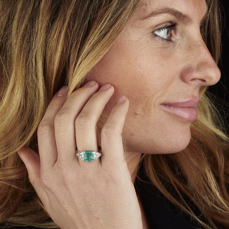 in oro bianco 18kt, impreziosito al centro da uno smeraldo taglio ottagonale di ct 2 circa, affiancato da diamanti taglio brillante per ct 0.50 circa, punzone 750, mis. 16/56, gr. 6