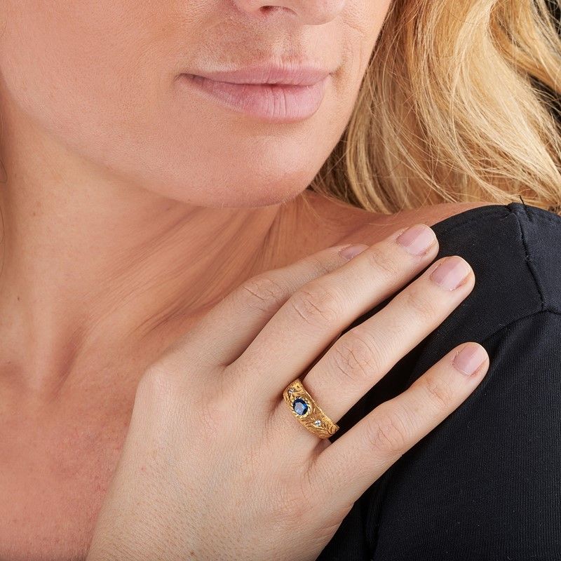 in oro giallo satinato 18kt, impreziosito al centro da uno zaffiro taglio ovale di ct 0.50 circa affiancato da due diamanti taglio brillante, mis. 12/52, gr. 8