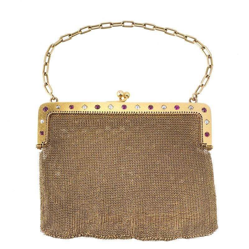 in oro giallo 18kt, realizzata a maglia tessita, chiusura impreziosita da rubini taglio rotondo per ct 1.50 circa e diamanti taglio vecchio per ct 1.20 circa, corredata di tasca interna e catena, dim. cm 12,5x11, gr. 240