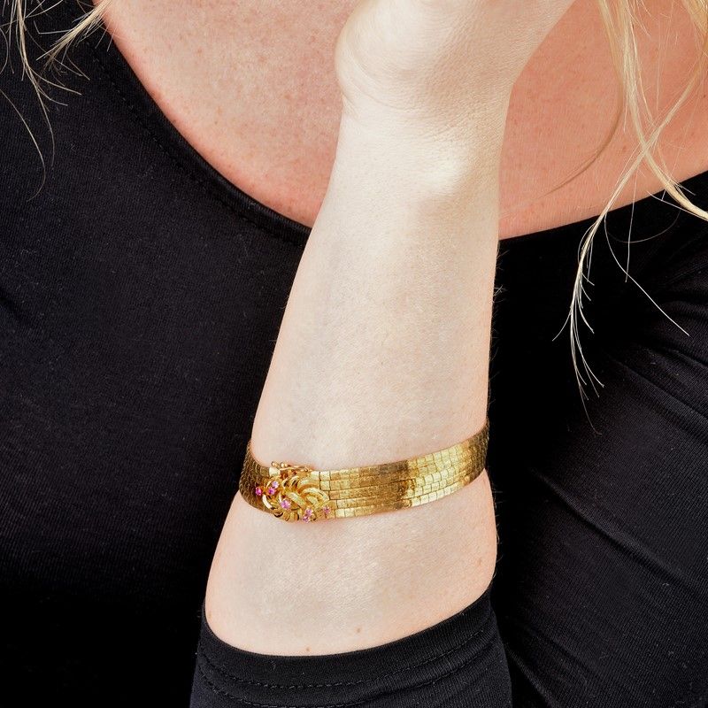 in oro giallo 18kt, composto da cinque fili di maglie quadrate satinate, fermatura impreziosita da rubini taglio rotondo, punzoni 750 e del fabbricante", lungh. cm 19, gr. 38