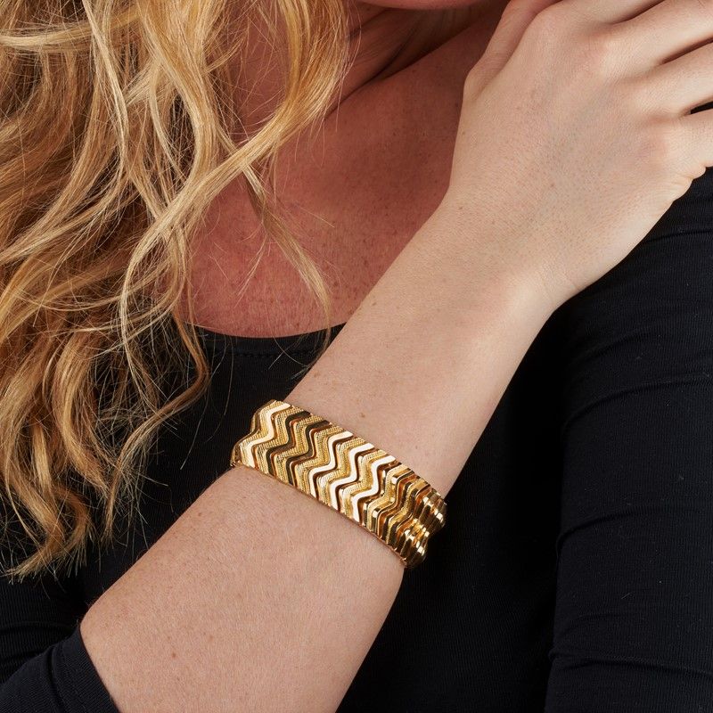 in oro giallo 18kt, realizzato seguendo un motivo chevron, punzoni 750 e del fabbricante "18VI", lungh. cm 18,5, gr. 56