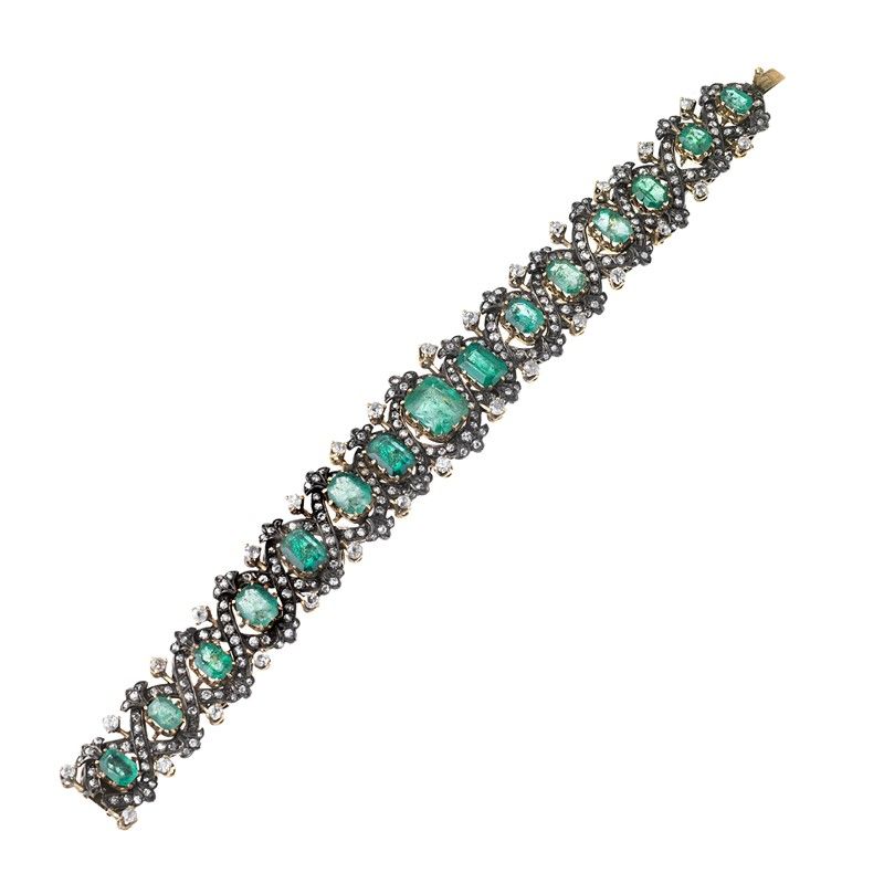 in oro e argento, realizzato seguendo un motivo a intreccio, impreziosito da una fila centrale di smearldi digradanti per ct 16 circa circondati da diamanti taglio vecchio per ct 6.70 circa, lungh. cm 19, gr. 55