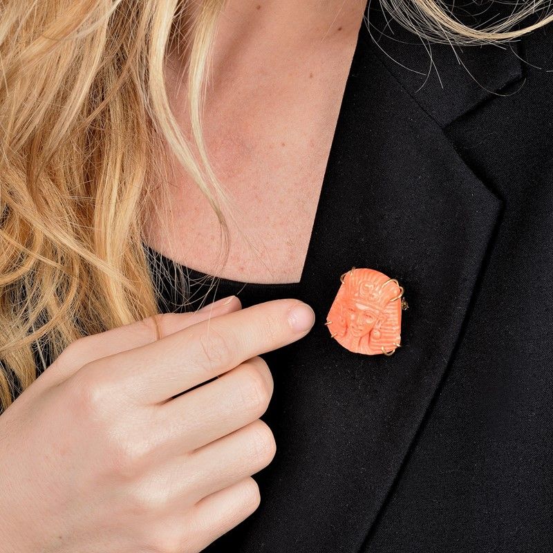 CORAL BANGLE BRACELET AND A PHARAOH-SHAPED PENDANT/BROOCH IN 18KT YELLOW GOLD