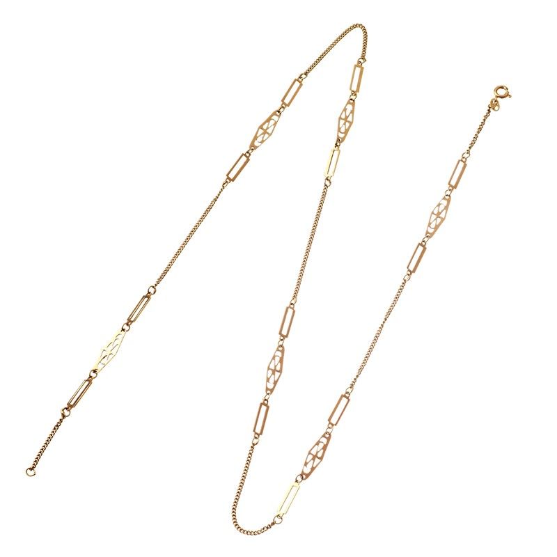 in oro giallo 18kt, composta da una serie di maglie geometriche traforate, punzoni 750 e del fabbricante, lungh. cm 66, gr. 12