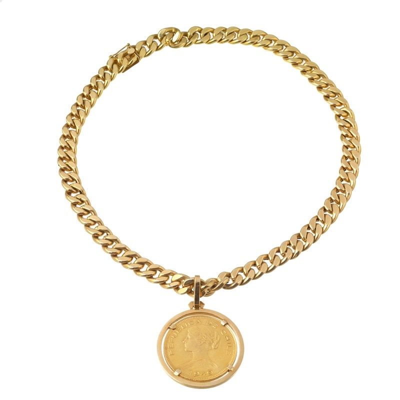 COLLANA A CATENA CON PENDENTE in oro giallo 18kt, catena realizzata a maglia groumette, da cui pende un ciondolo recante una moneta di dieci pesos cileni, lungh. cm 41, punzoni 750 e del fabbricante, dim. pendente cm 3,5x5, punzoni 750 e 18kt, gr. 69