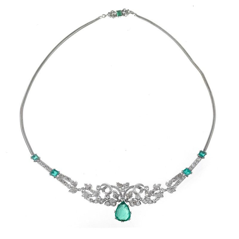 in oro bianco 18kt, impreziosita da smeraldi taglio a goccia e carré per ct 4 circa, diamanti taglio brillante e huit huit per ct 3 circa, lungh. cm 42, gr. 25