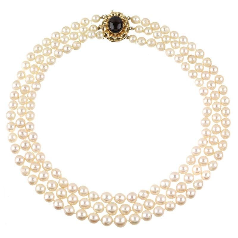 composta da tre fili di perle leggermente digradanti di mm 9-6 circa, fermatura in oro 18kt, punzone 750, lungh. cm 42, gr. 101