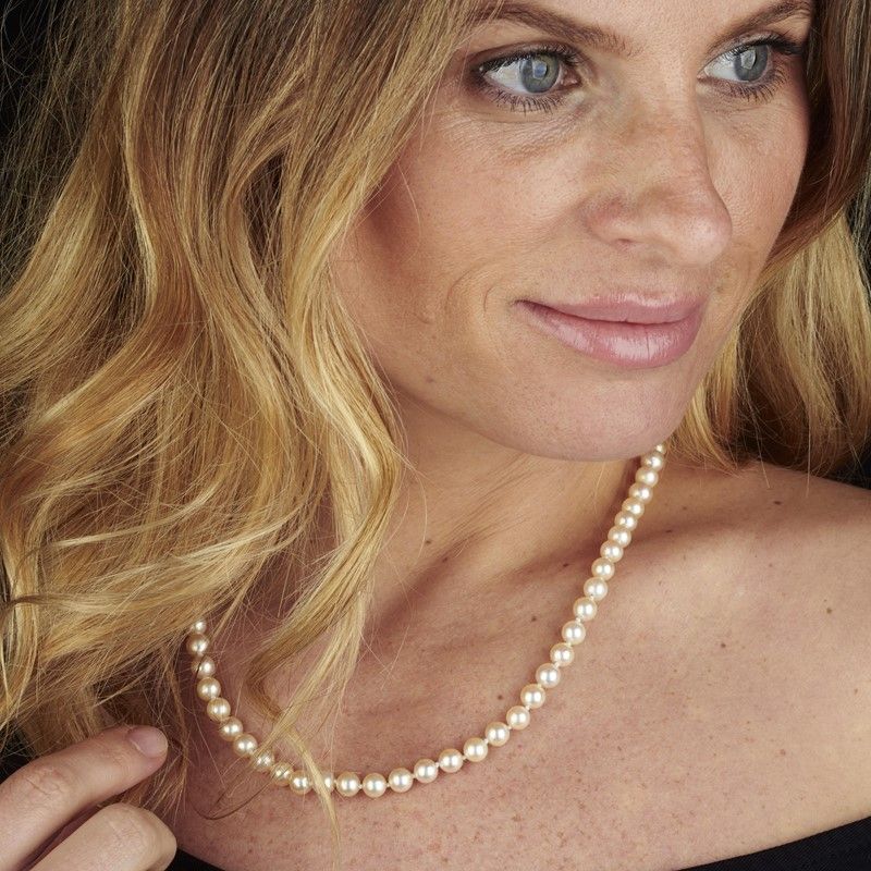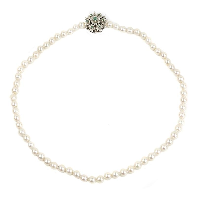 composta da un filo di perle di mm 6 circa, fermatura a forma di fiore in oro bianco 18kt impreziosita da smeraldi taglio rotondo per ct 0.40 circa, punzone 750, lugh. cm 47,5, gr. 35
