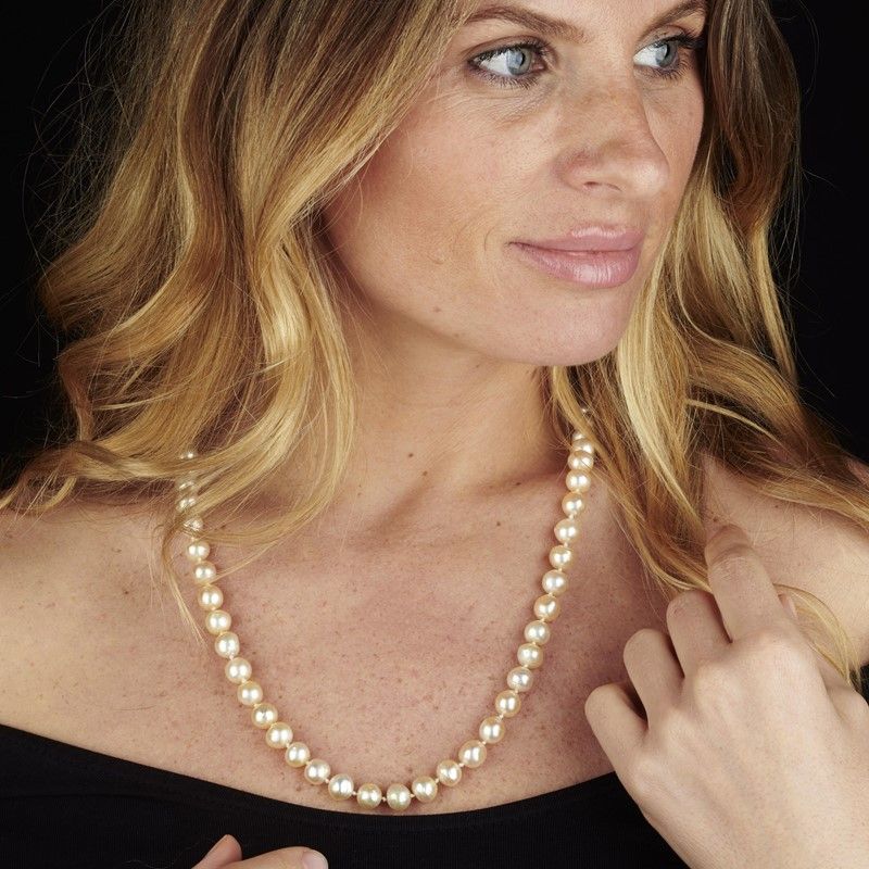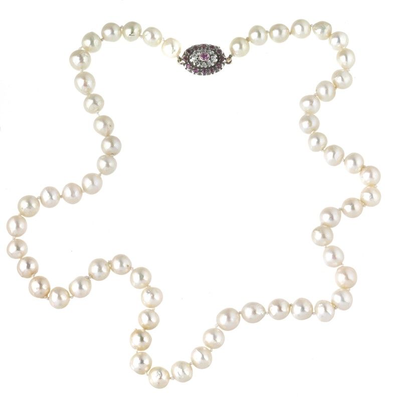 composta da un filo di perle di mm 8 circa, fermatura in oro e argento con rubini taglio rotondo e rose di diamante, lungh. cm 61, gr. 68
