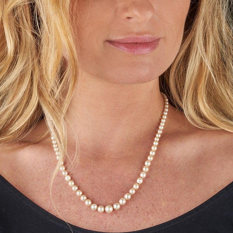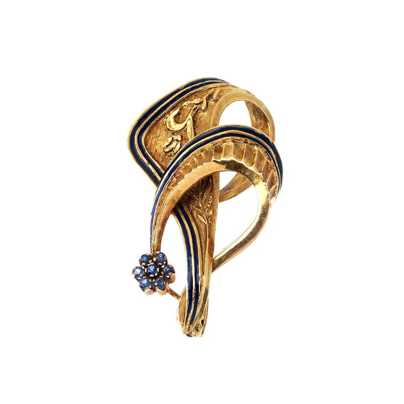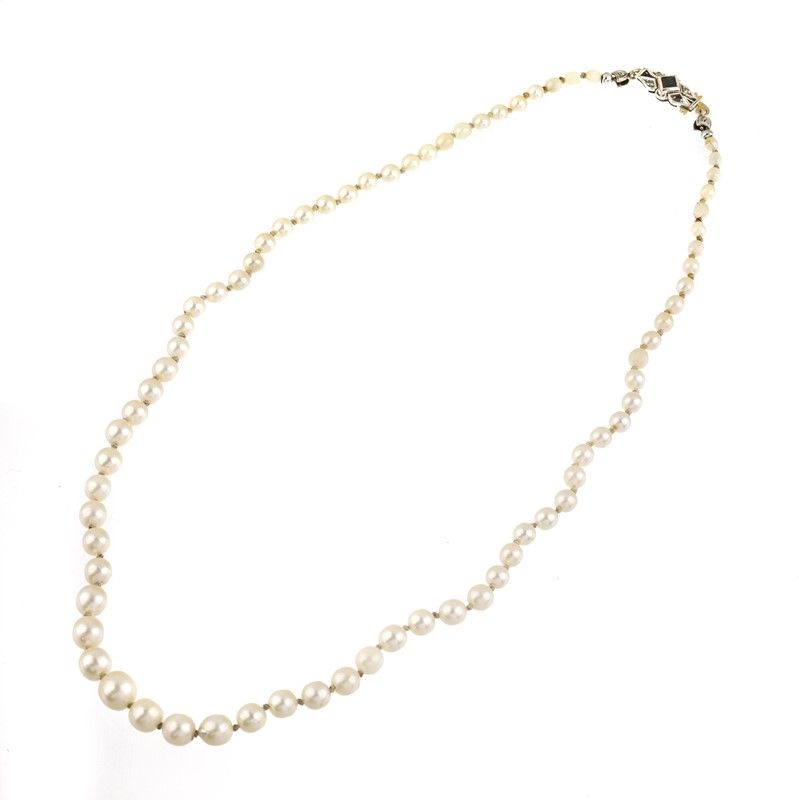 composta da un filo di perle digradanti di mm 7-3 circa, fermatura in oro bianco 18kt impreziosita da uno zaffiro taglio carré (difetti) e quattro diamanti taglio huit huit, lungh. cm 47, gr. 17, accompagnata da una spilla a forma di fiocco in oro giallo 18kt, decorata in smalto, impreziosita da zaffiri taglio rotondo, punzoni 750 e del fabbricante, dim. cm 4, gr. 9