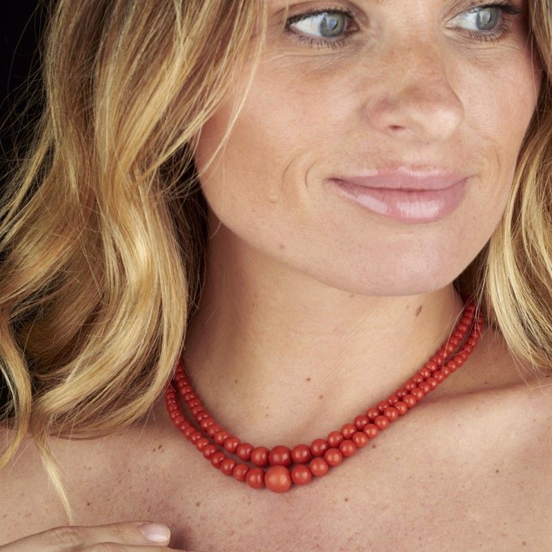 composta da due fili di boules in corallo digradanti di mm 11-4 circa, fermatura in oro 9kt, lungh. cm 40, gr. 40