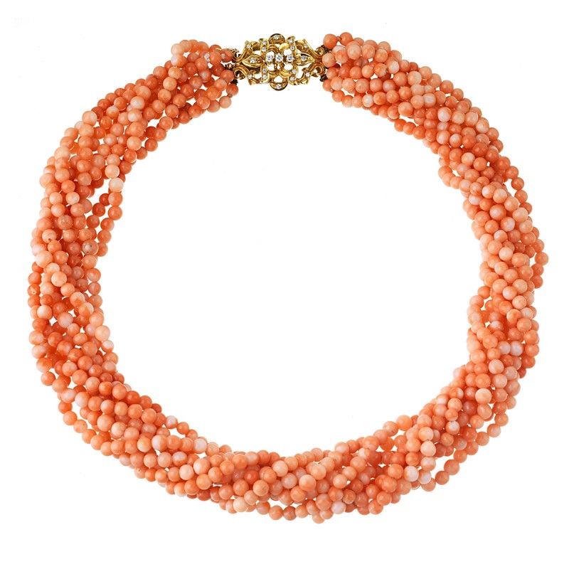 a nove fili di piccole sfere in corallo rosa di mm 4 circa, fermatura in oro giallo e bianco 18kt impreziosita da diamanti taglio brillante e huit huit per ct 0.20 circa, punzone 750, lungh. cm 40, gr. 97