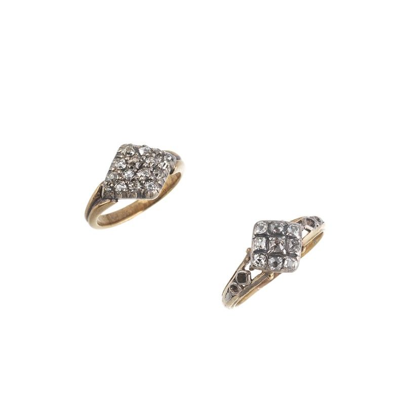 in oro e argento, impreziositi da diamanti taglio vecchio per ct 0.20 circa, mis. 13/53 e 4/44, gr. 5 complessivi