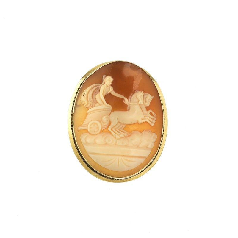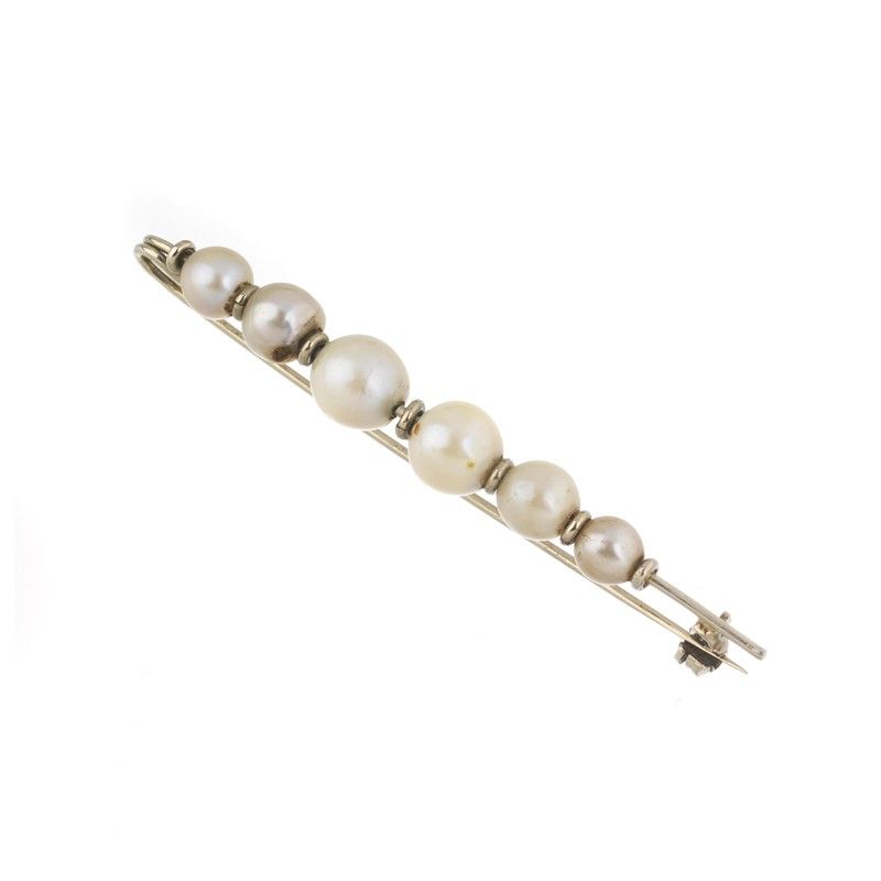di cui una in oro giallo 18kt, con al centro un cammeo su conchiglia, punzone 750, dim. cm 3x3,5, accompagnata da una seconda spilla in oro bianco 18kt, impreziosita da perle digradanti di mm 7-5 circa, lungh. cm 6, gr. 11 complessivi