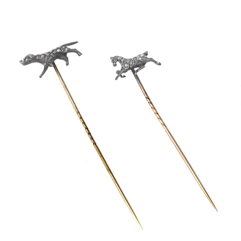 in oro a basso titolo e argento, raffiguranti sulla sommità un cane e un cavallo, impreziositi da rose di diamante, lungh. cm 7,5 e 7, gr. 4 complessivi