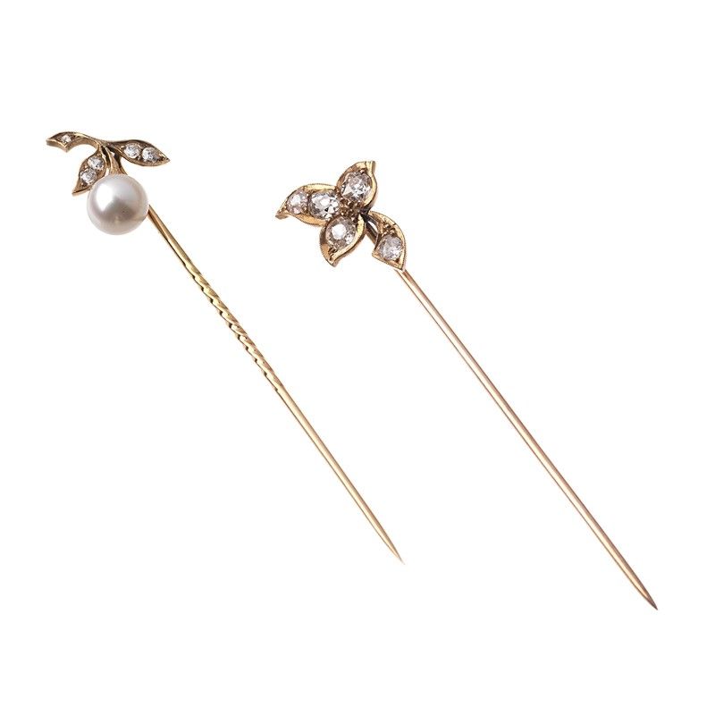 DUE SPILLE CON PERLA E DIAMANTI di cui una in oro giallo 18kt di gr. 2 circa, accompagnata da una seconda spilla in oro a basso titolo, sormontate da tralci, impreziosite da diamanti taglio vecchio e a rosa per ct 1 circa, lungh. cm 7, gr. 4 complessivi