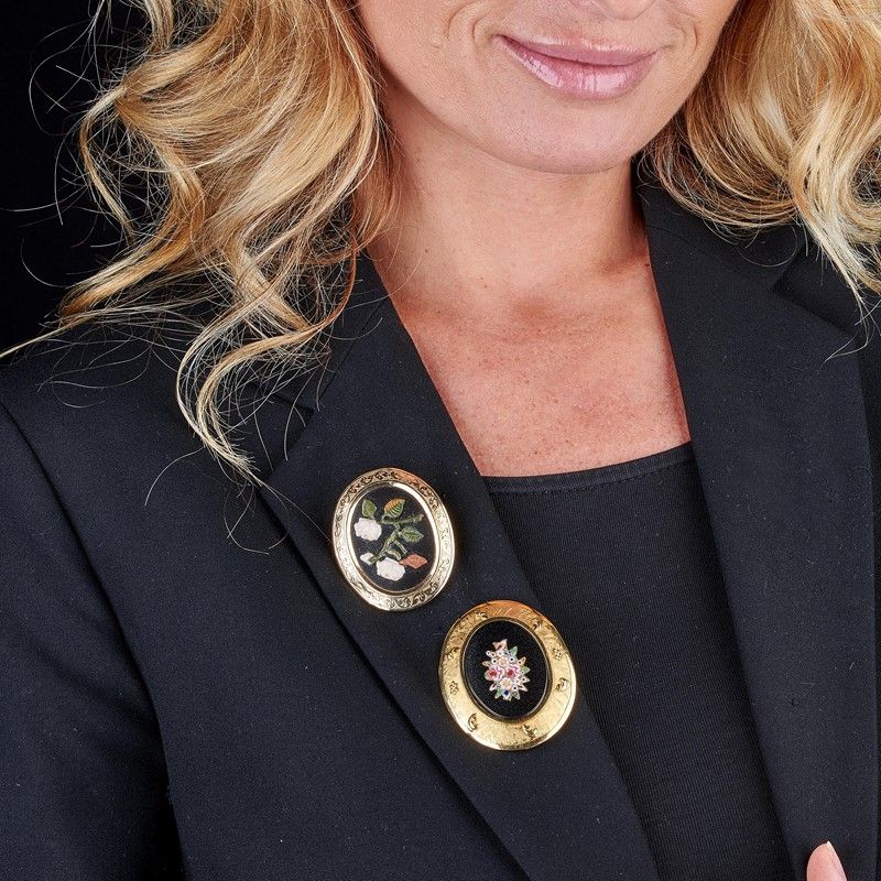 di cui una in oro giallo 18kt e una in oro 14kt, di forma ovale, con al centro motivi floreali in pietra dura, dim. cm 4,5x5,5 e 4x5 circa, gr. 54 complessivi