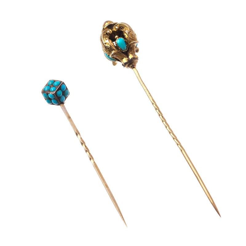 TWO TURQUOISE PINS IN GOLD AND SILVER