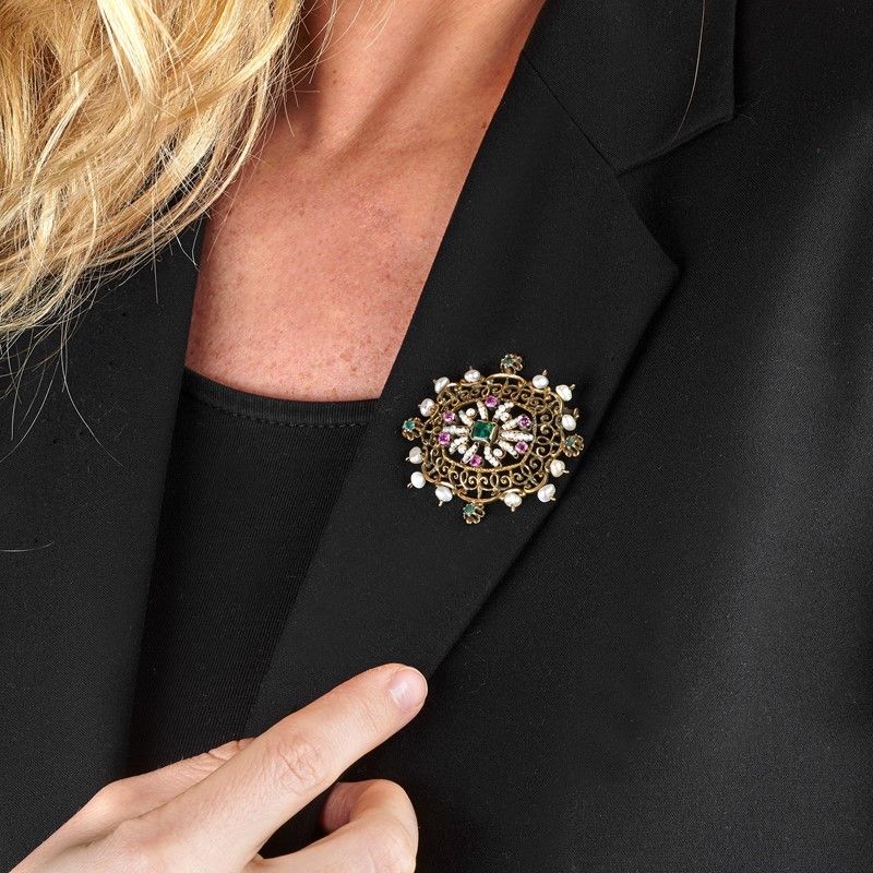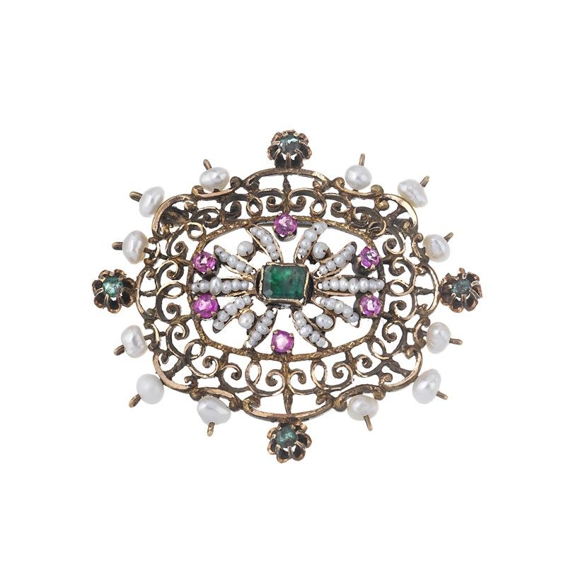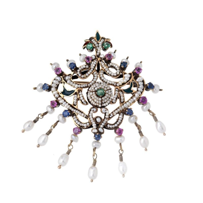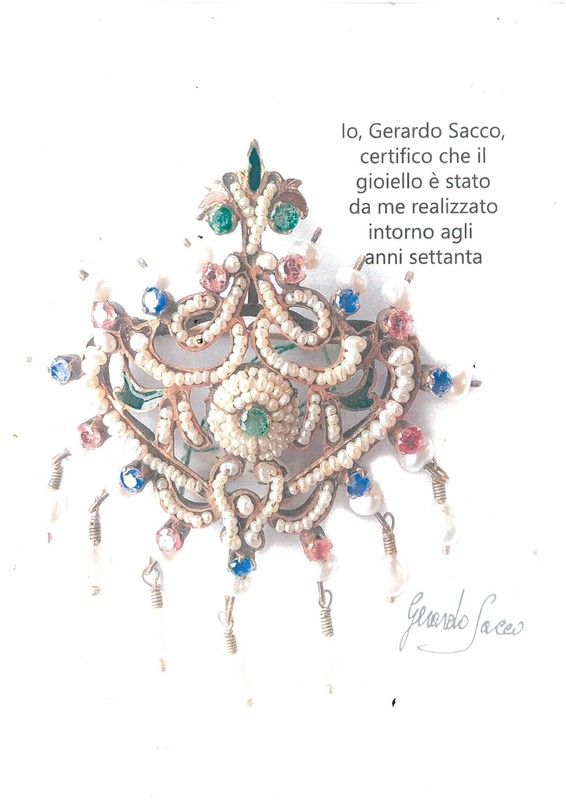 GERARDO SACCO DUE SPILLE CON PERLE E PIETRE DI COLORE in oro a basso titolo e metallo, realizzate seguendo un motivo a traforo, impreziosite da piccole perle e decorate in smalto, dim. cm 5,5x6,5 e cm 5x4,5 circa, gr. 29 complessivi. Corredate di copie di expertise.
