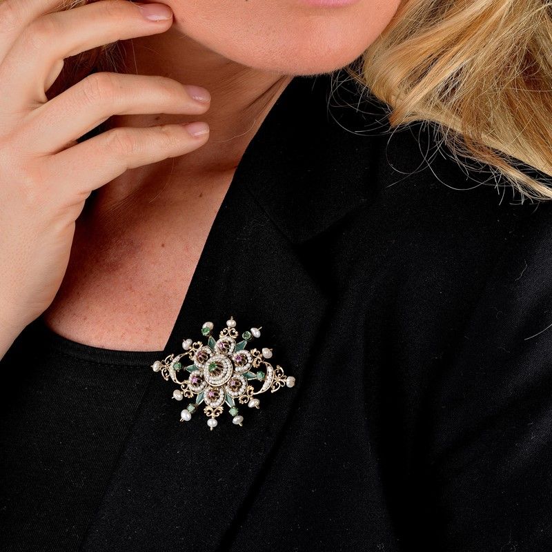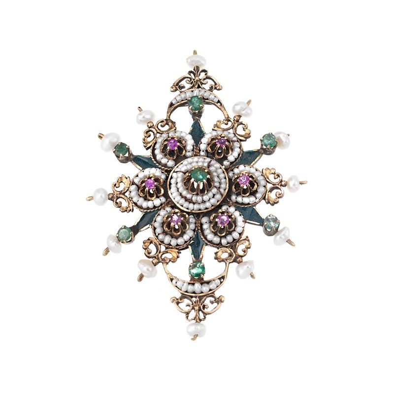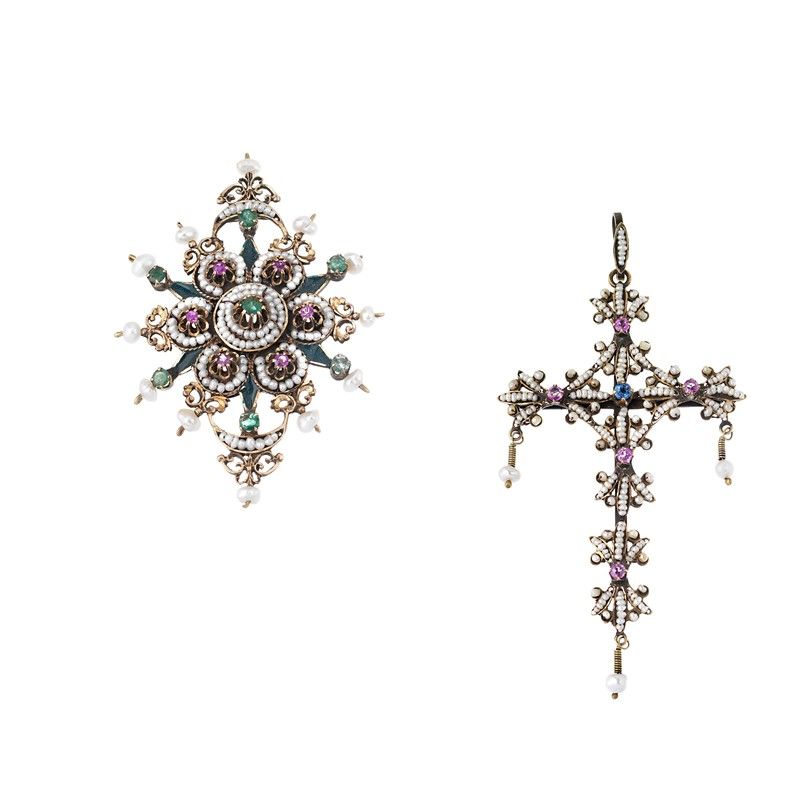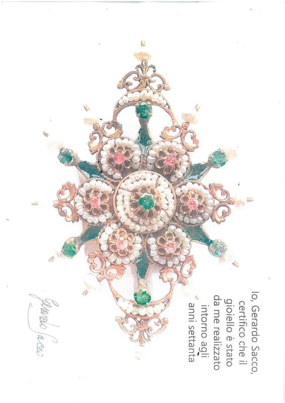 GERARDO SACCO PENDENTE A FORMA DI CROCE CON SPILLA in oro a basso titollo e metallo, impreziositi da microperle, realizzati seguendo un motivo a traforo, decorati in smalto verde, dim. pendente cm 5x10, dim. spilla cm 6,5x4,5, gr. 23 complessivi. Corredati di copie di expertise.
