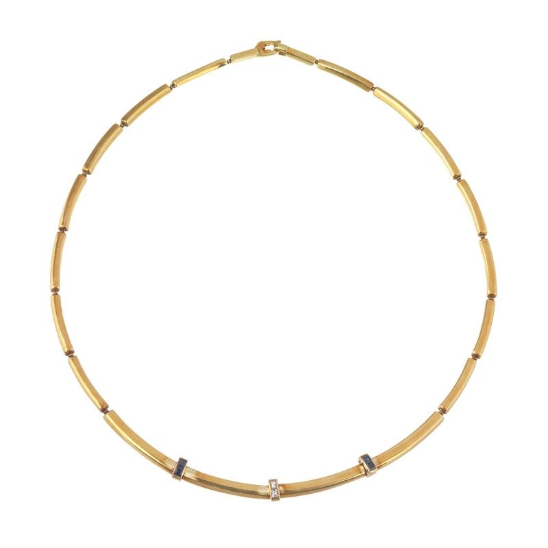 GIROCOLLO A SEGMENTI CON ZAFFIRI E DIAMANTI in oro giallo 18kt, impreziosito da quattro zaffiri taglio carré per ct 0.40 circa e due diamanti taglio baguette per ct 0.20 circa, punzoni 750 e del fabbricante, lungh. cm 43, gr. 21