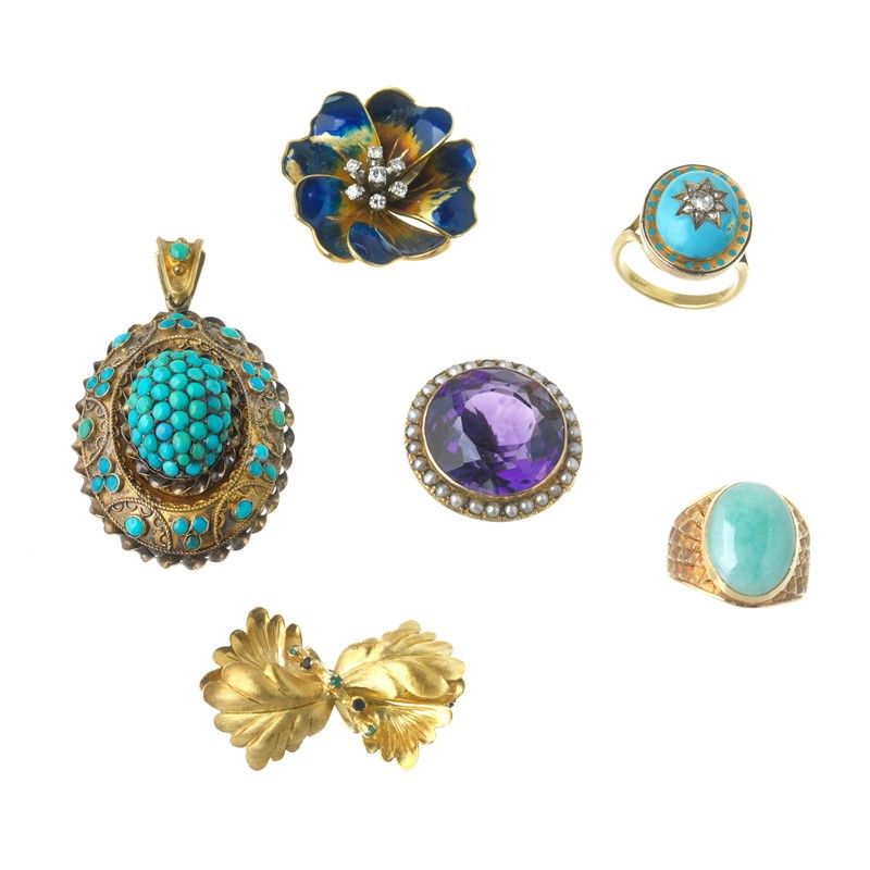 composto da una spilla in oro giallo e bianco 18kt, a forma di fiore, decorata in smalto, con al centro diamanti taglio brillante per ct 0.20 circa, punzone 18kt, dim. cm 3x3 circa; un anello in oro giallo 18kt e a basso titolo, decorato in smalto (difetti), con al centro una stella di diamanti taglio vecchio e a rosa, mis. 12/52; una spilla a forma di tralci in oro giallo 18kt, punzone 750, dim. cm 3,5x2 circa; una spilla in oro a basso titolo, al centro un'ametista sfaccettata di ct 20 circa con contorno di microperle, dim. cm 2,5x2,5 circa; un anello chevalier in oro giallo 18kt con pietra dura, mis. 14/54; gr. 38 complessivi; accompagnati da un pendente in metallo e piccole sfere in turchese, dim. cm 3x5 circa, gr. 14