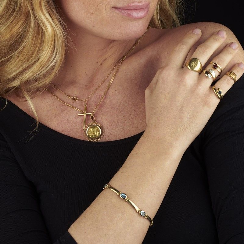 in oro giallo 18kt, composto da due collane con pendenti, lungh. cm 68; un bracciale a segmenti con pietre semipreziose sfaccettate, lungh. cm 18,5; un paio di gemelli di forma ovale, dim. cm 1x2x2 circa; cinque anelli di varie misure, di cui tre a serpe e due formato chevalier; un pendente a forma di cuore e un fermasoldi con inciso il nome "Gabriele", dim. cm 1,5x5 circa, gr. 62 complessivi