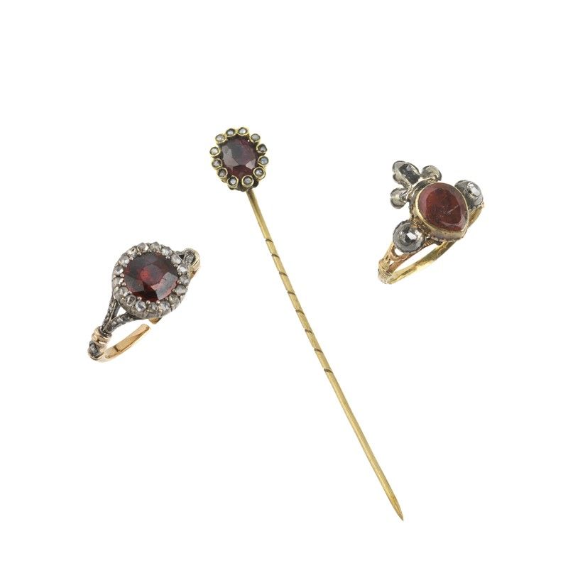 in oro e argento, composto da due anelli e una spilla impreziositi da rose di diamante, mis. anelli 15/55 e 13/53, lungh. spilla cm 6, gr. 9 complessivi