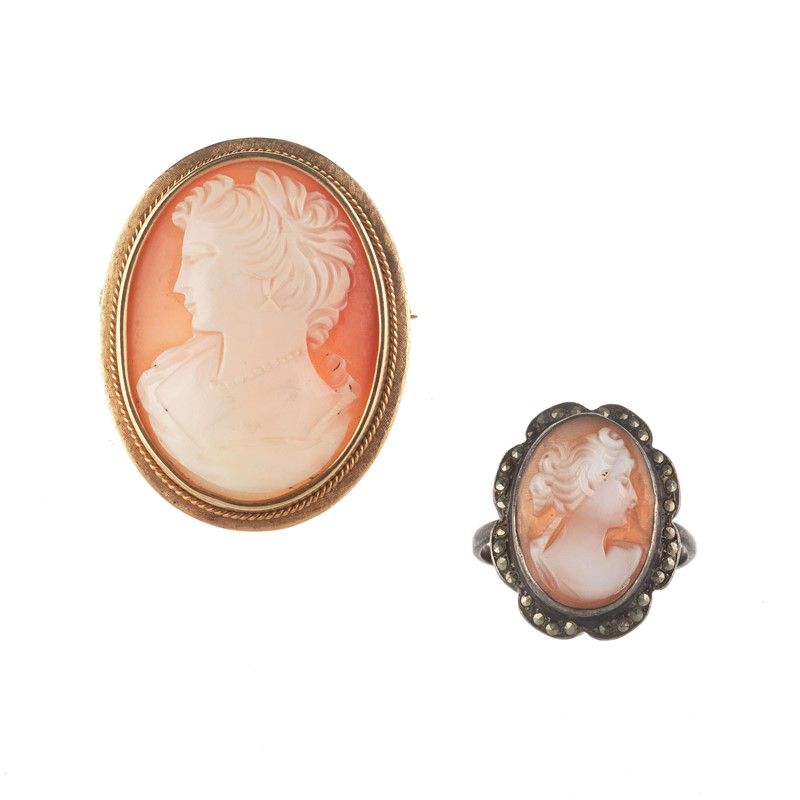 spilla/pendente in oro 18kt con cammeo in conchiglia, dim. cm 4,5x3, gr. 13, accompagnata da un anello in argento con cammeo in conchiglia, mis. 58, gr. 4